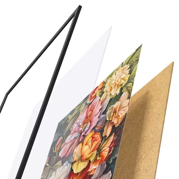 Plakatą sudaro rėmas, pleksiklas, atspausdintas vaizdas ir medžio drožlių plokštės pagrindas. Plakatą galima iš karto pakabinti ant sienos dėl kitoje pusėje esančių laikiklių.