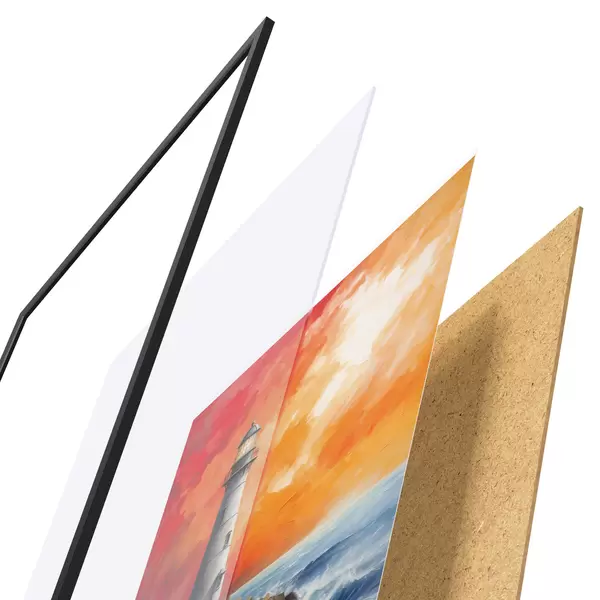 Plakatą sudaro rėmas, pleksiklas, atspausdintas vaizdas ir medžio drožlių plokštės pagrindas. Plakatą galima iš karto pakabinti ant sienos dėl kitoje pusėje esančių laikiklių.