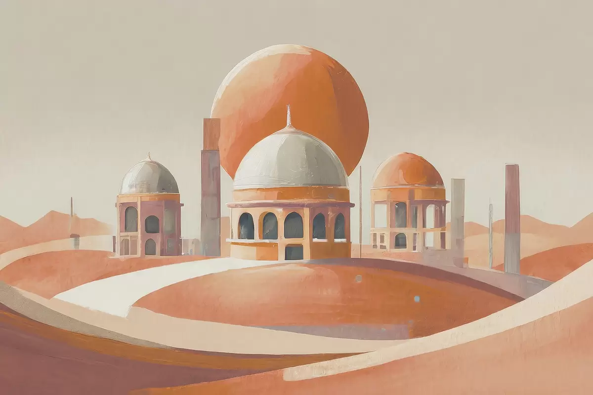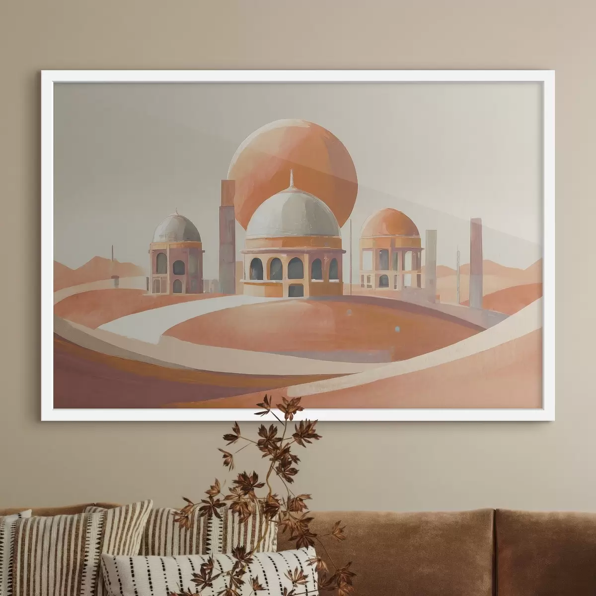 Plakatas Dykumos kraštovaizdis su pastatais ir dideliu oranžiniu kamuoliu f37812