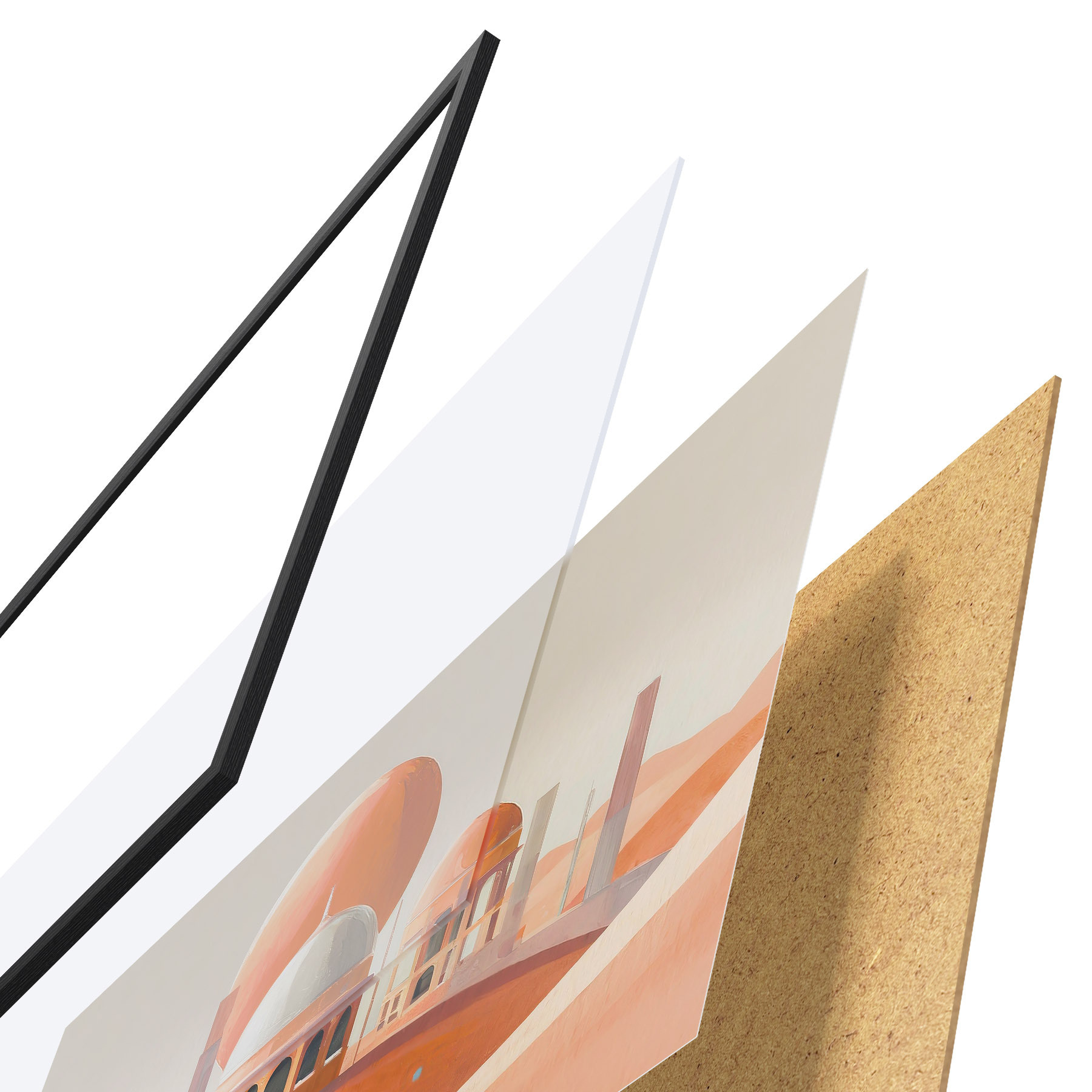 Plakatą sudaro rėmas, pleksiklas, atspausdintas vaizdas ir medžio drožlių plokštės pagrindas. Plakatą galima iš karto pakabinti ant sienos dėl kitoje pusėje esančių laikiklių.