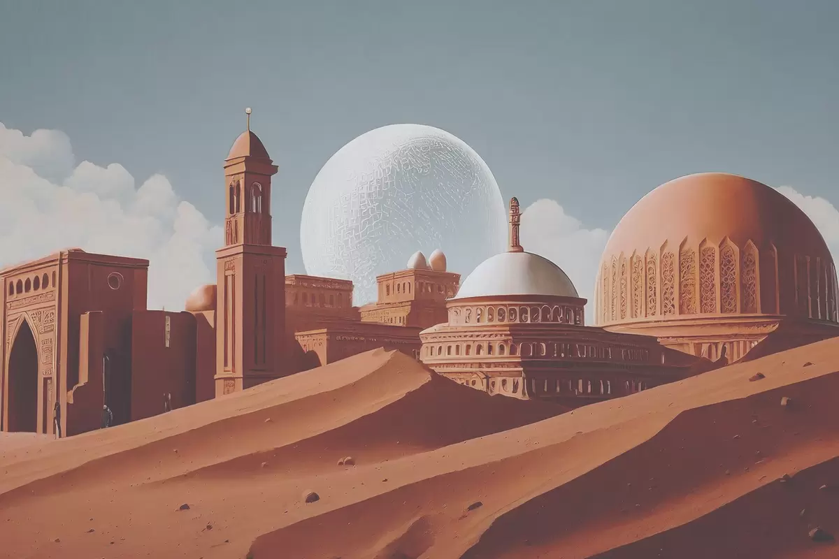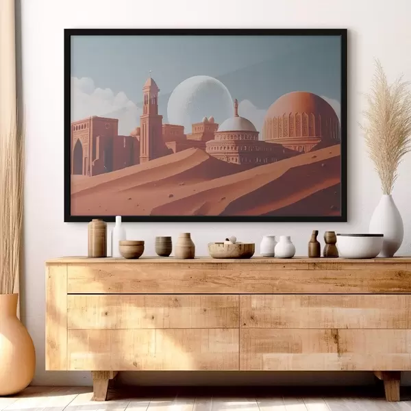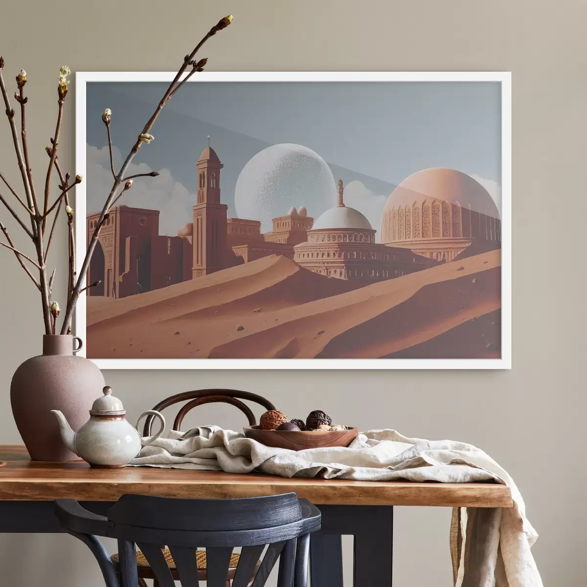 Plakatas Dykumos kraštovaizdis su pastatais ir dideliu baltu kamuoliu Ne f37814