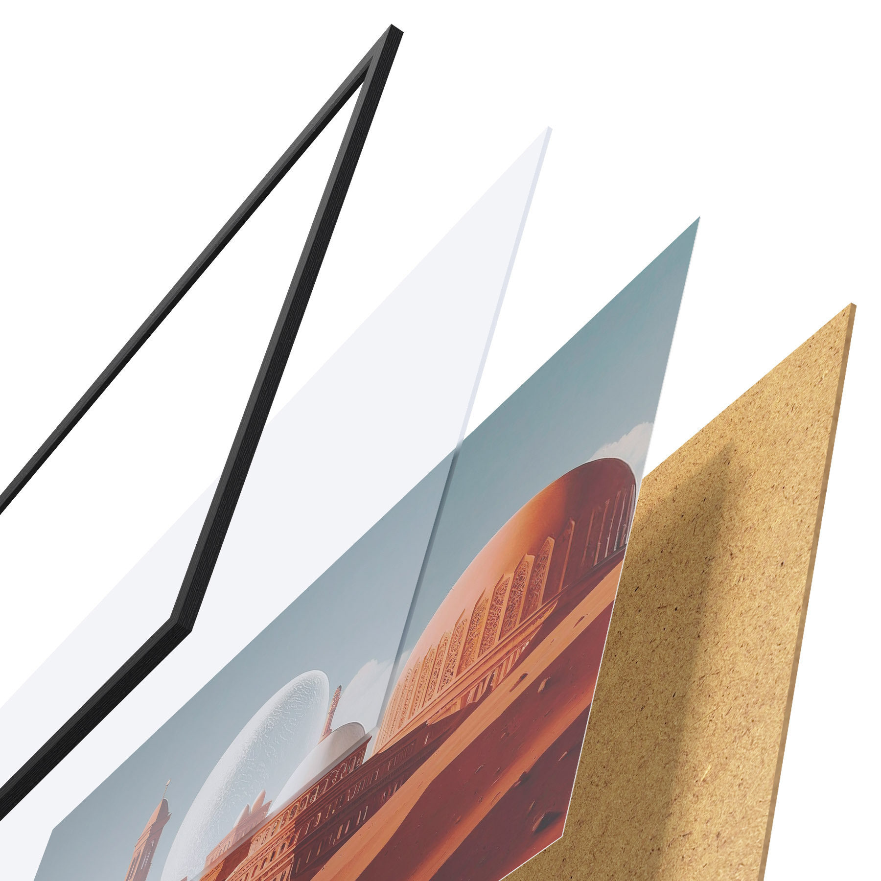 Plakatą sudaro rėmas, pleksiklas, atspausdintas vaizdas ir medžio drožlių plokštės pagrindas. Plakatą galima iš karto pakabinti ant sienos dėl kitoje pusėje esančių laikiklių.
