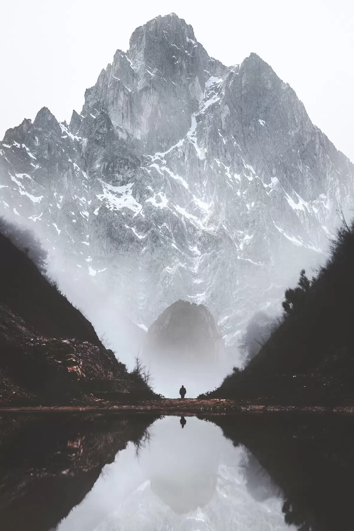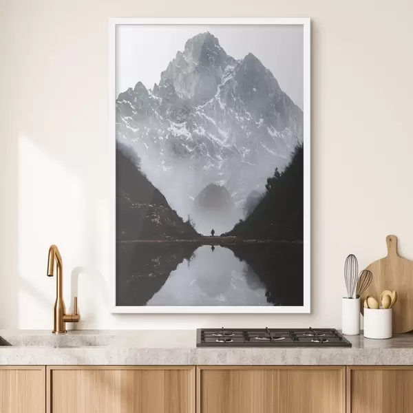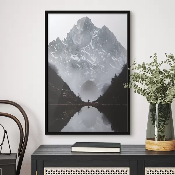 Plakatas Migloti kalnai, atspindintys ramų ežerą Ne f37828