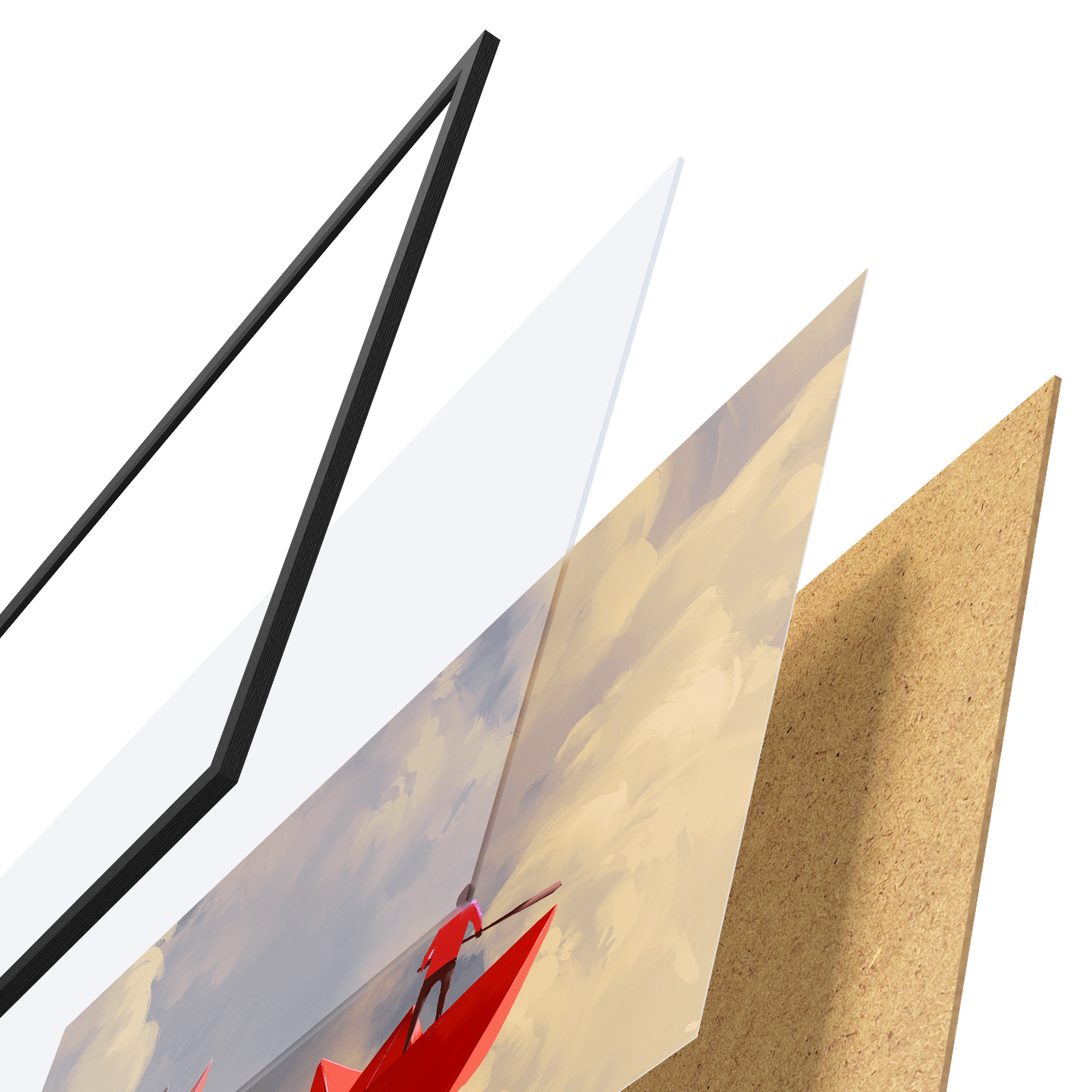 Plakatą sudaro rėmas, pleksiklas, atspausdintas vaizdas ir medžio drožlių plokštės pagrindas. Plakatą galima iš karto pakabinti ant sienos dėl kitoje pusėje esančių laikiklių.