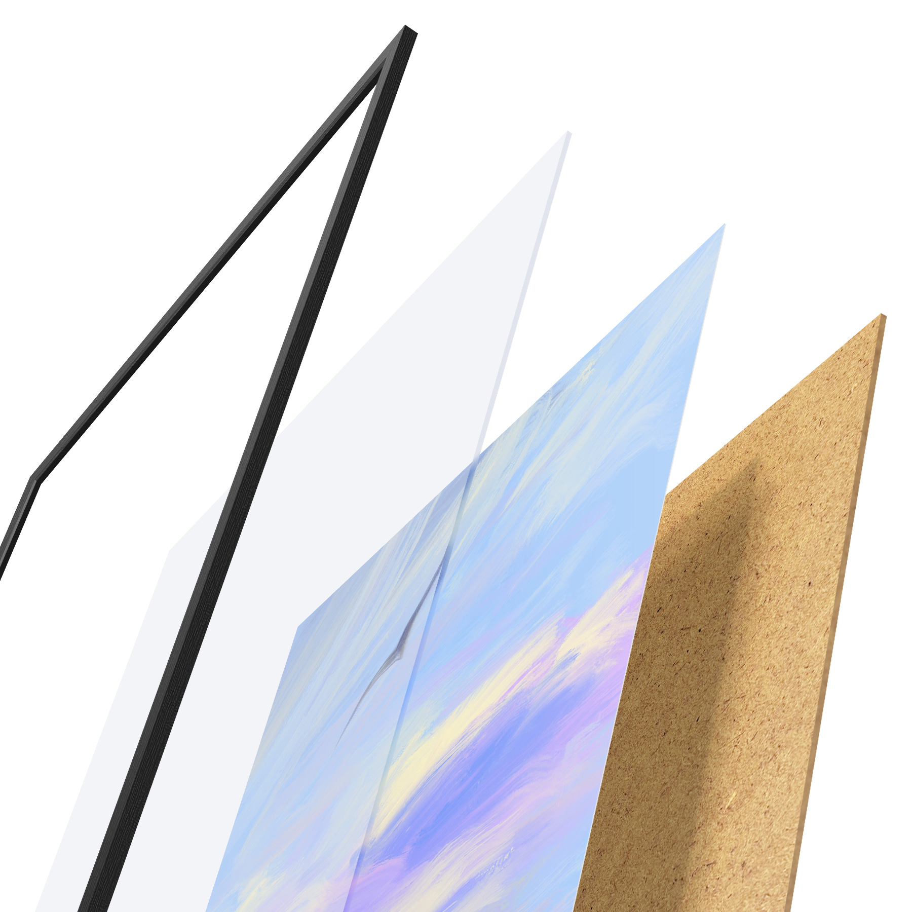 Plakatą sudaro rėmas, pleksiklas, atspausdintas vaizdas ir medžio drožlių plokštės pagrindas. Plakatą galima iš karto pakabinti ant sienos dėl kitoje pusėje esančių laikiklių.