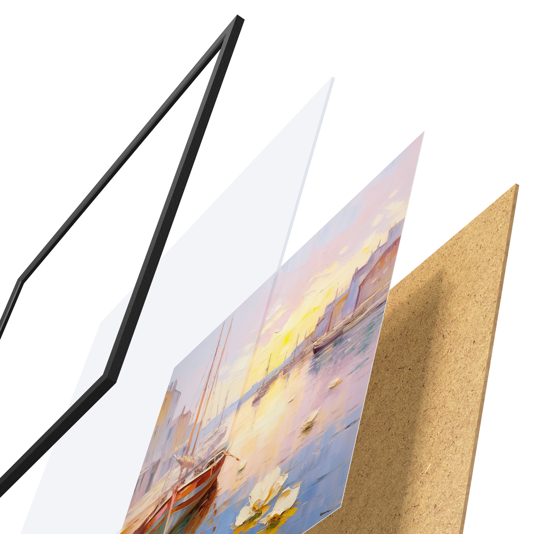Plakatą sudaro rėmas, pleksiklas, atspausdintas vaizdas ir medžio drožlių plokštės pagrindas. Plakatą galima iš karto pakabinti ant sienos dėl kitoje pusėje esančių laikiklių.