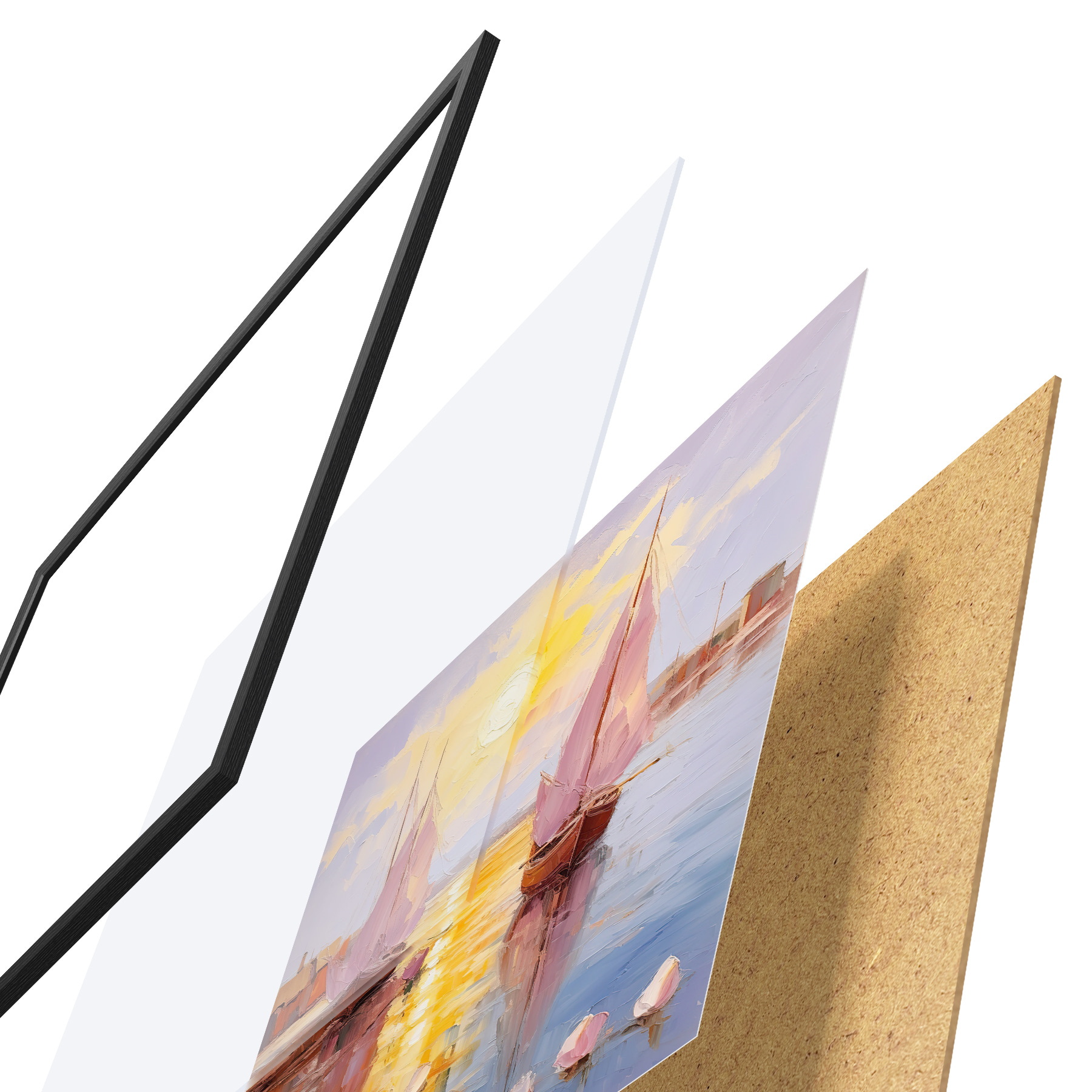 Plakatą sudaro rėmas, pleksiklas, atspausdintas vaizdas ir medžio drožlių plokštės pagrindas. Plakatą galima iš karto pakabinti ant sienos dėl kitoje pusėje esančių laikiklių.