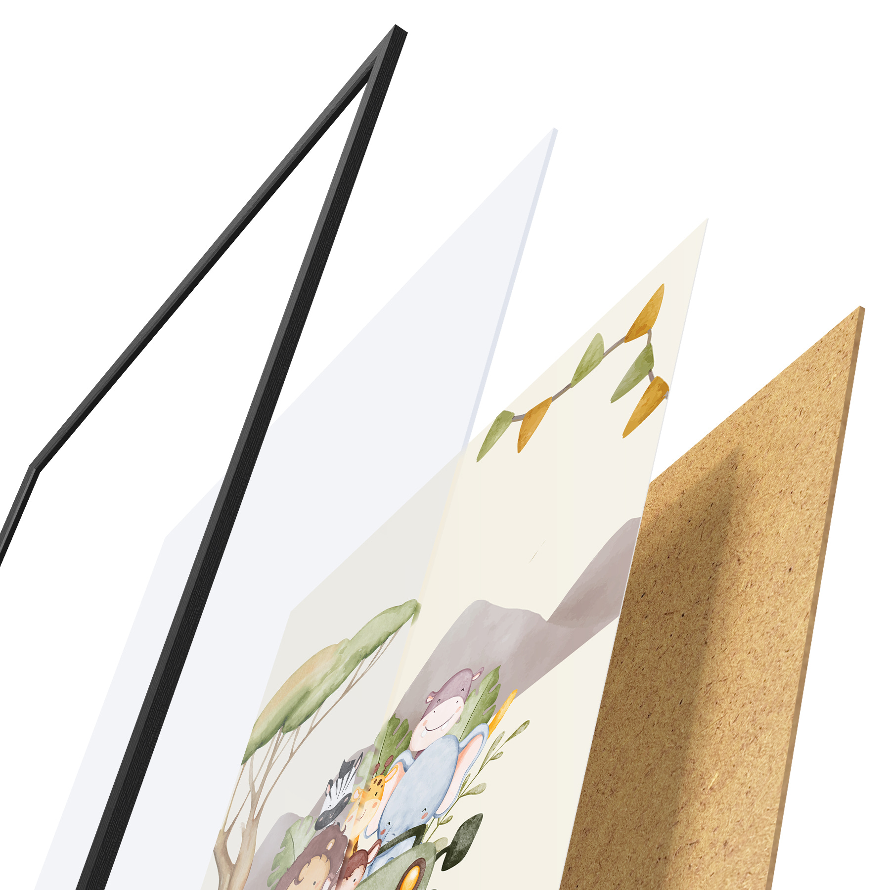 Plakatą sudaro rėmas, pleksiklas, atspausdintas vaizdas ir medžio drožlių plokštės pagrindas. Plakatą galima iš karto pakabinti ant sienos dėl kitoje pusėje esančių laikiklių.