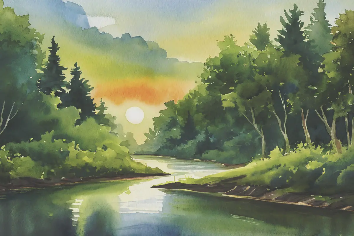 Plakatas Ramus saulėlydis virš ramios upės f37949