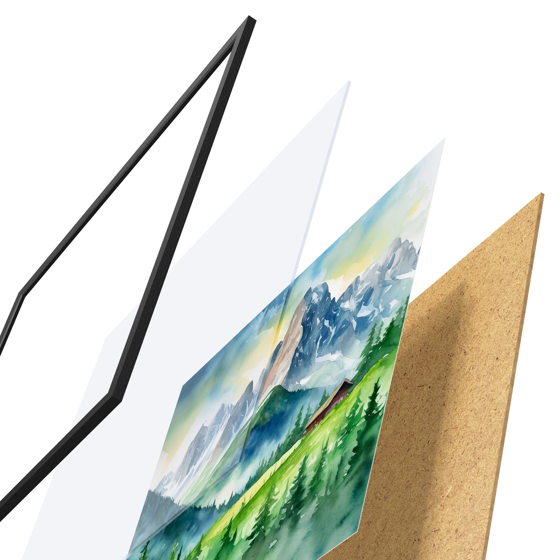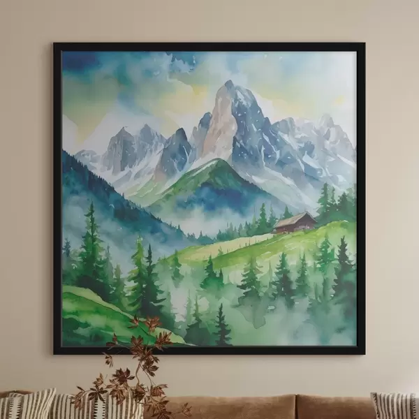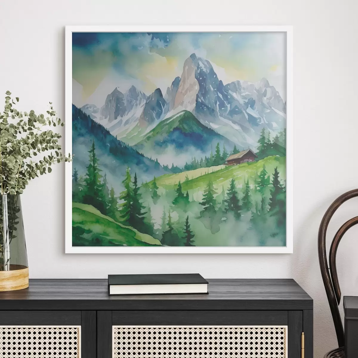 Plakatas Ramūs kalnai su vešliais žaliais medžiais f37959