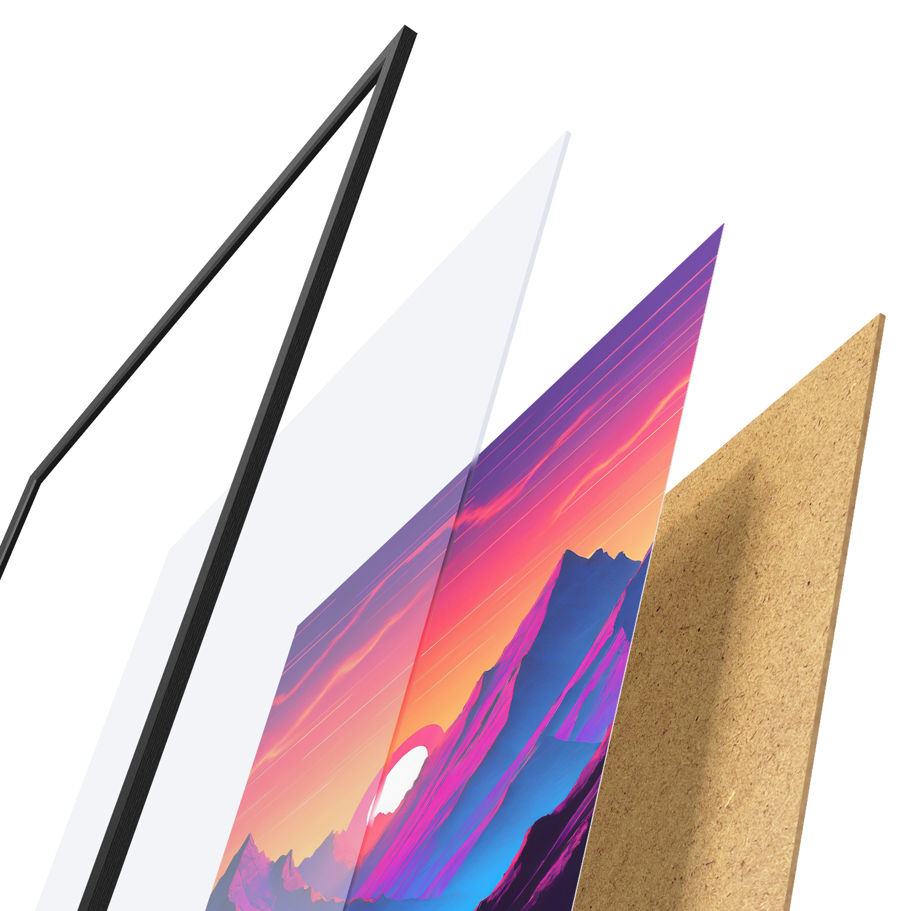 Plakatą sudaro rėmas, pleksiklas, atspausdintas vaizdas ir medžio drožlių plokštės pagrindas. Plakatą galima iš karto pakabinti ant sienos dėl kitoje pusėje esančių laikiklių.