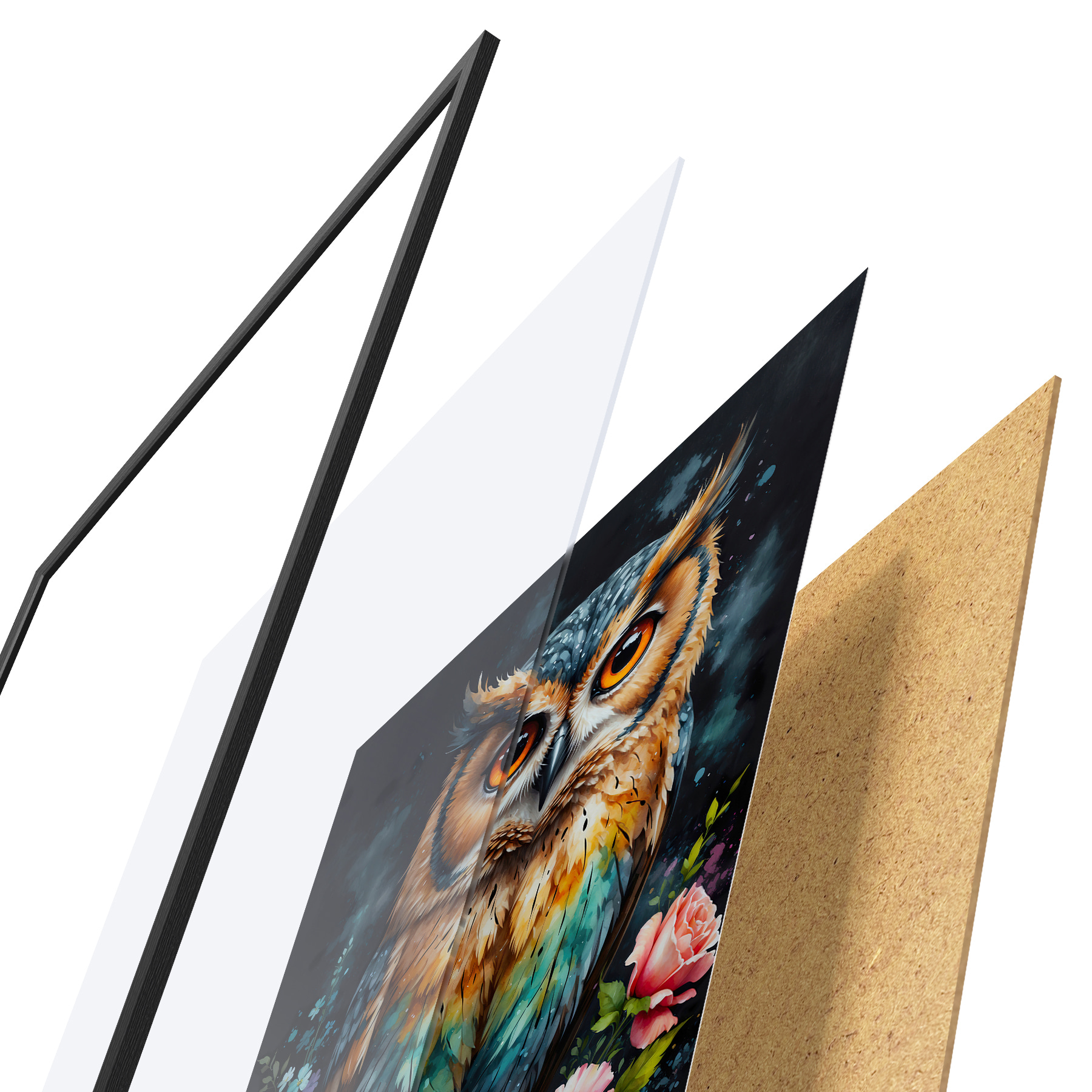 Plakatą sudaro rėmas, pleksiklas, atspausdintas vaizdas ir medžio drožlių plokštės pagrindas. Plakatą galima iš karto pakabinti ant sienos dėl kitoje pusėje esančių laikiklių.