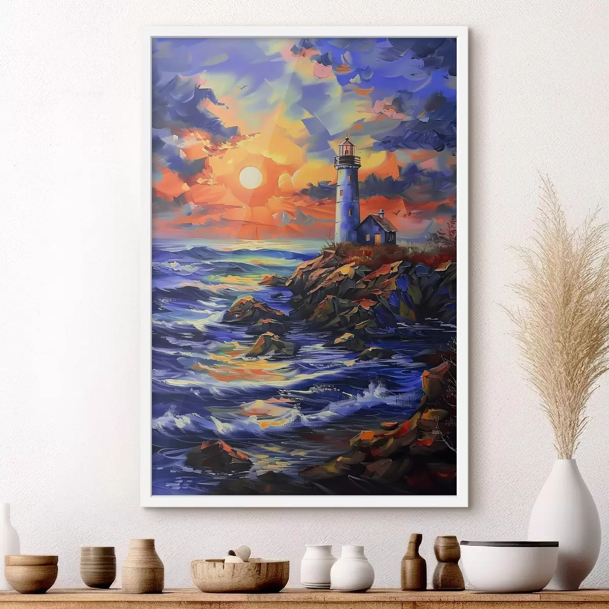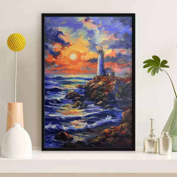 Plakatas Švyturys saulėlydžio metu prie jūros f38150