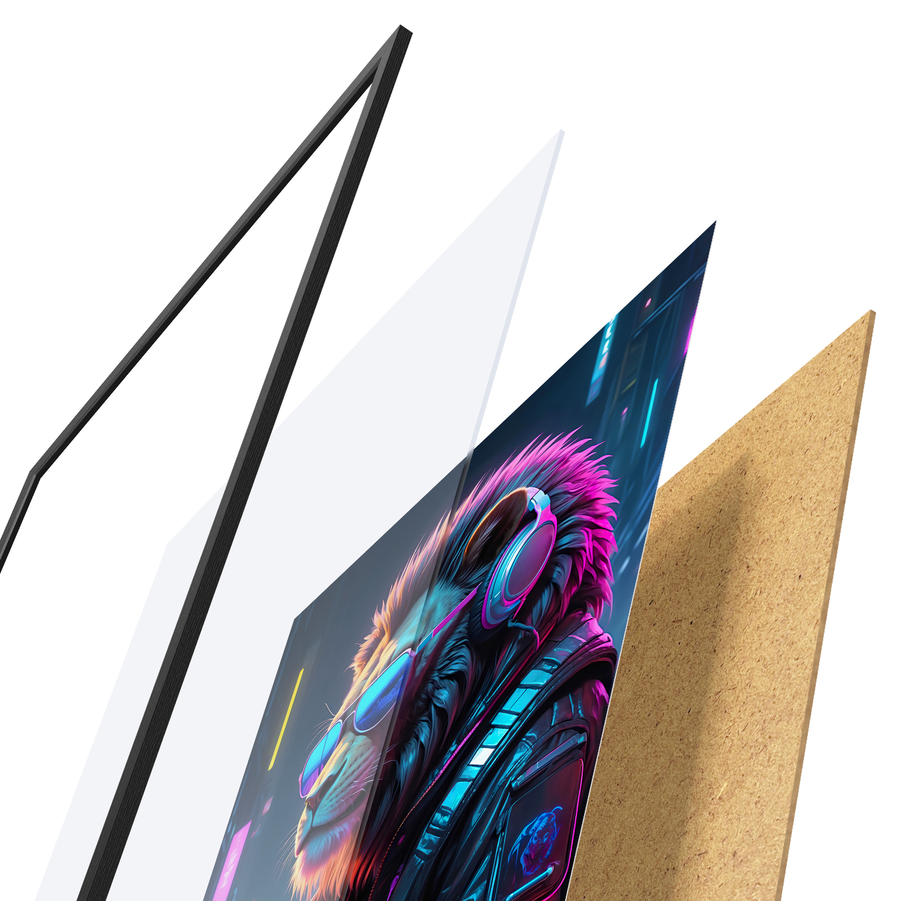 Plakatą sudaro rėmas, pleksiklas, atspausdintas vaizdas ir medžio drožlių plokštės pagrindas. Plakatą galima iš karto pakabinti ant sienos dėl kitoje pusėje esančių laikiklių.