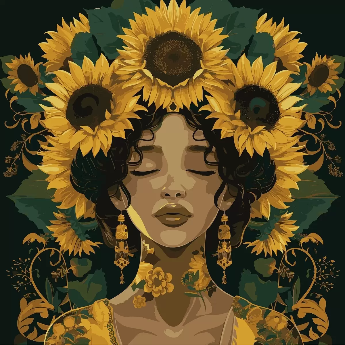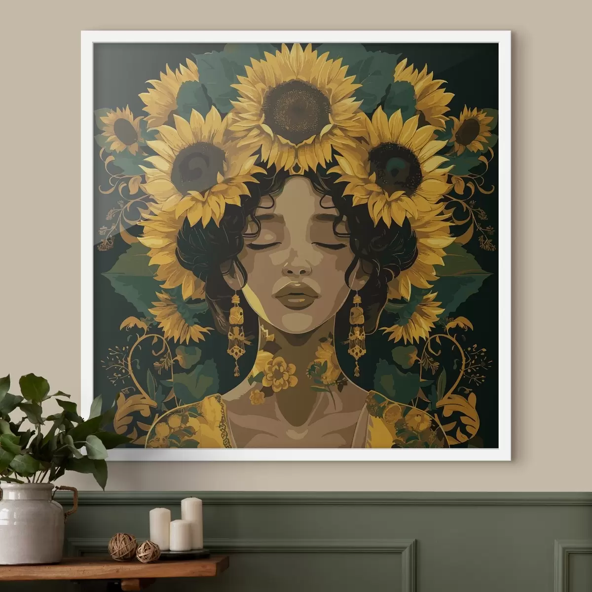 Plakatas Moteris su saulėgrąžomis plaukuose f38263