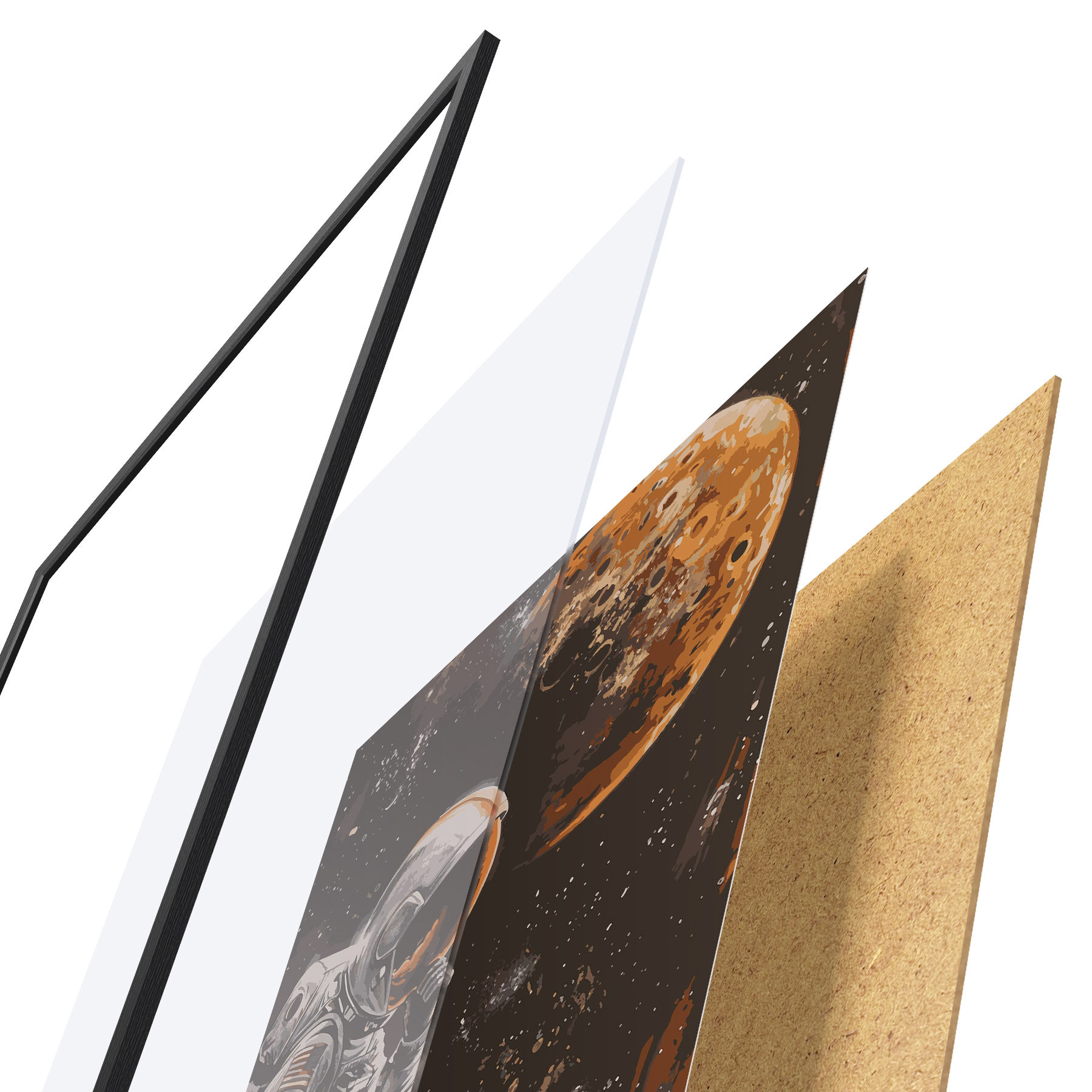 Plakatą sudaro rėmas, pleksiklas, atspausdintas vaizdas ir medžio drožlių plokštės pagrindas. Plakatą galima iš karto pakabinti ant sienos dėl kitoje pusėje esančių laikiklių.