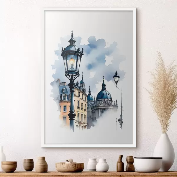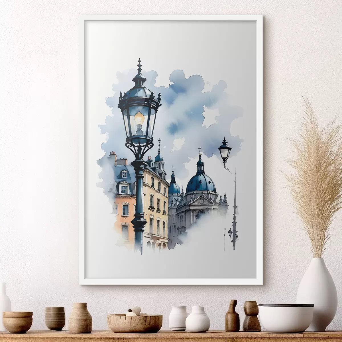 Plakatas Puošnus gatvės šviestuvas su kupolo formos pastatu debesuotą dieną f38364