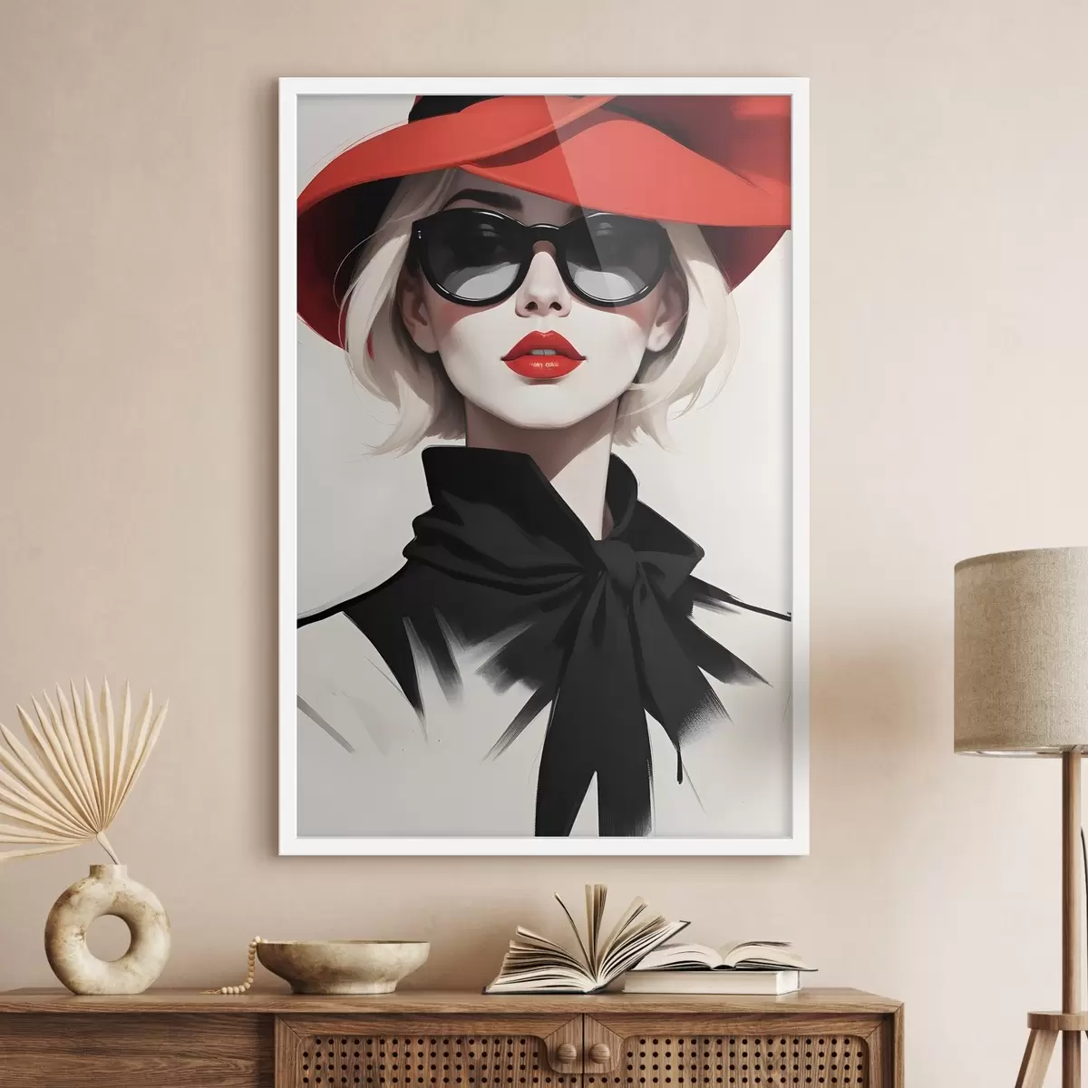 Plakatas Moteris su raudona skrybėle ir akiniais nuo saulės f38365