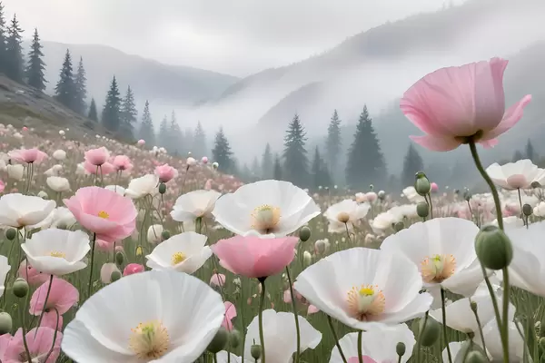 Plakatas Rožinių ir baltų aguonų laukas kalnų peizaže fone f38369