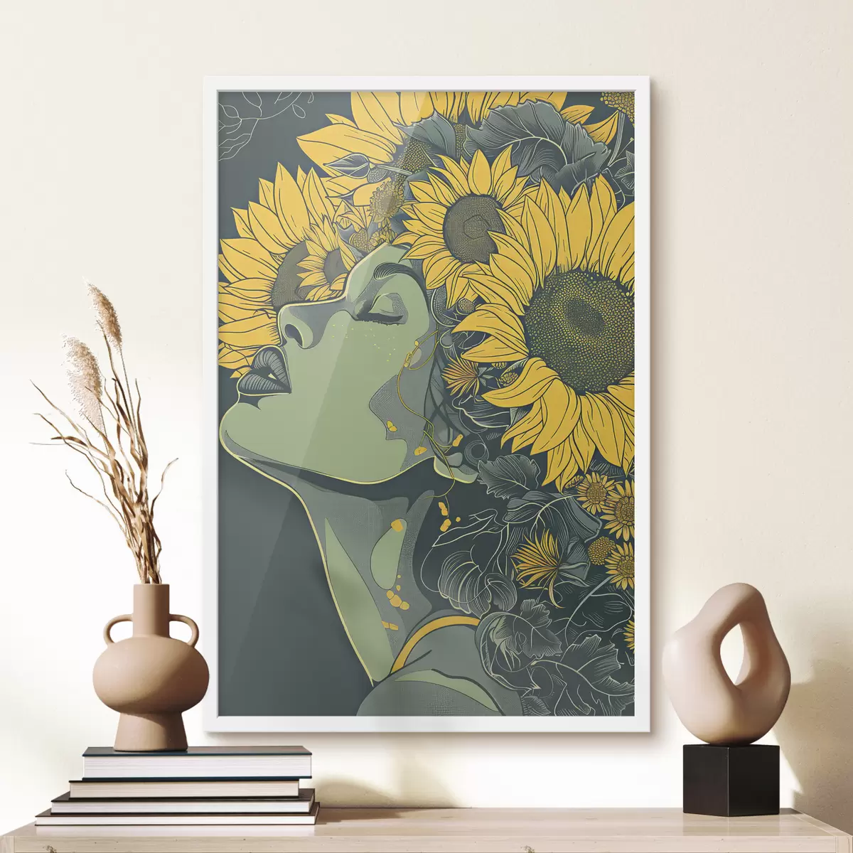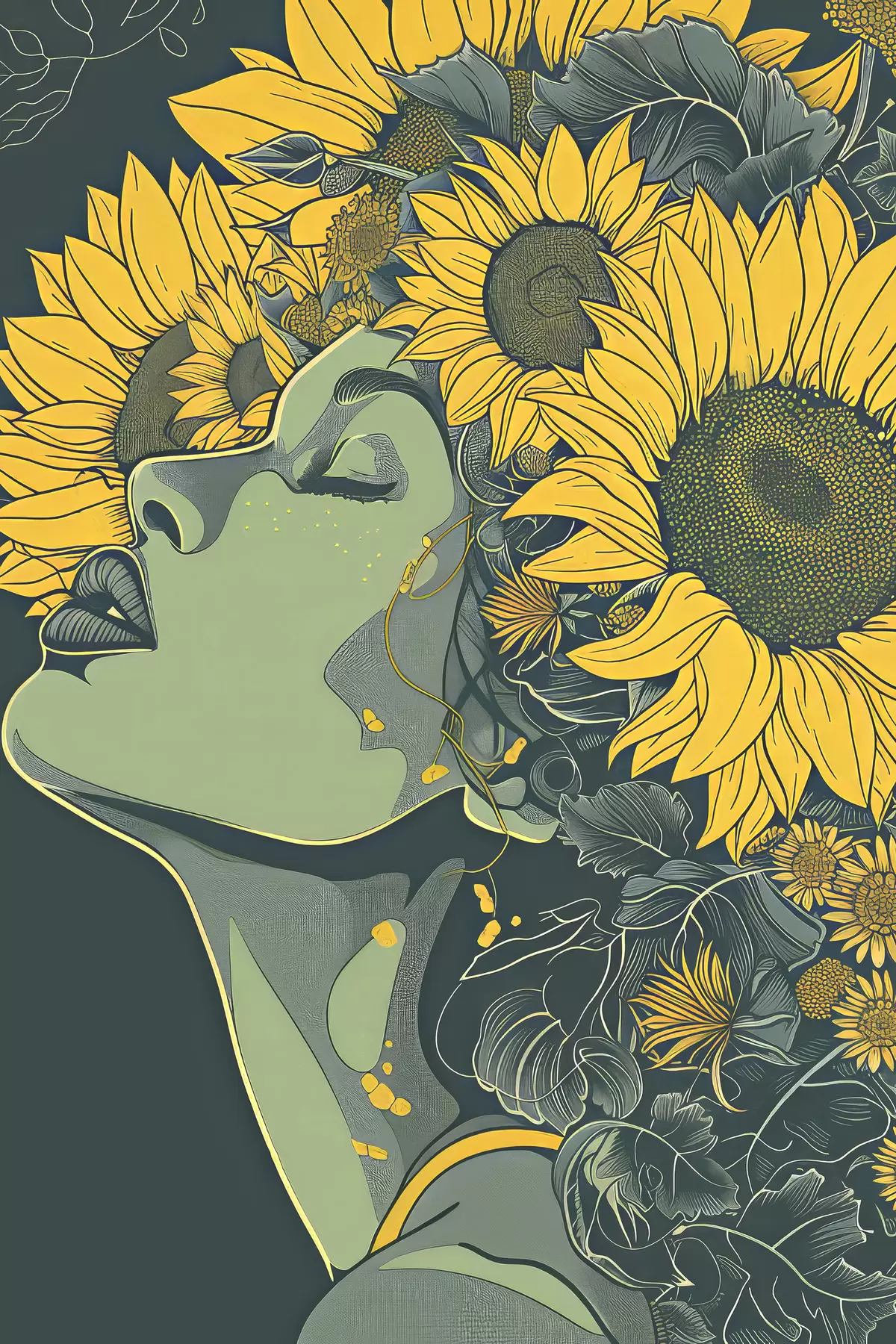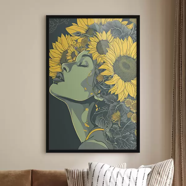 Plakatas Mergina saulėgrąžomis žaliame fone f38380