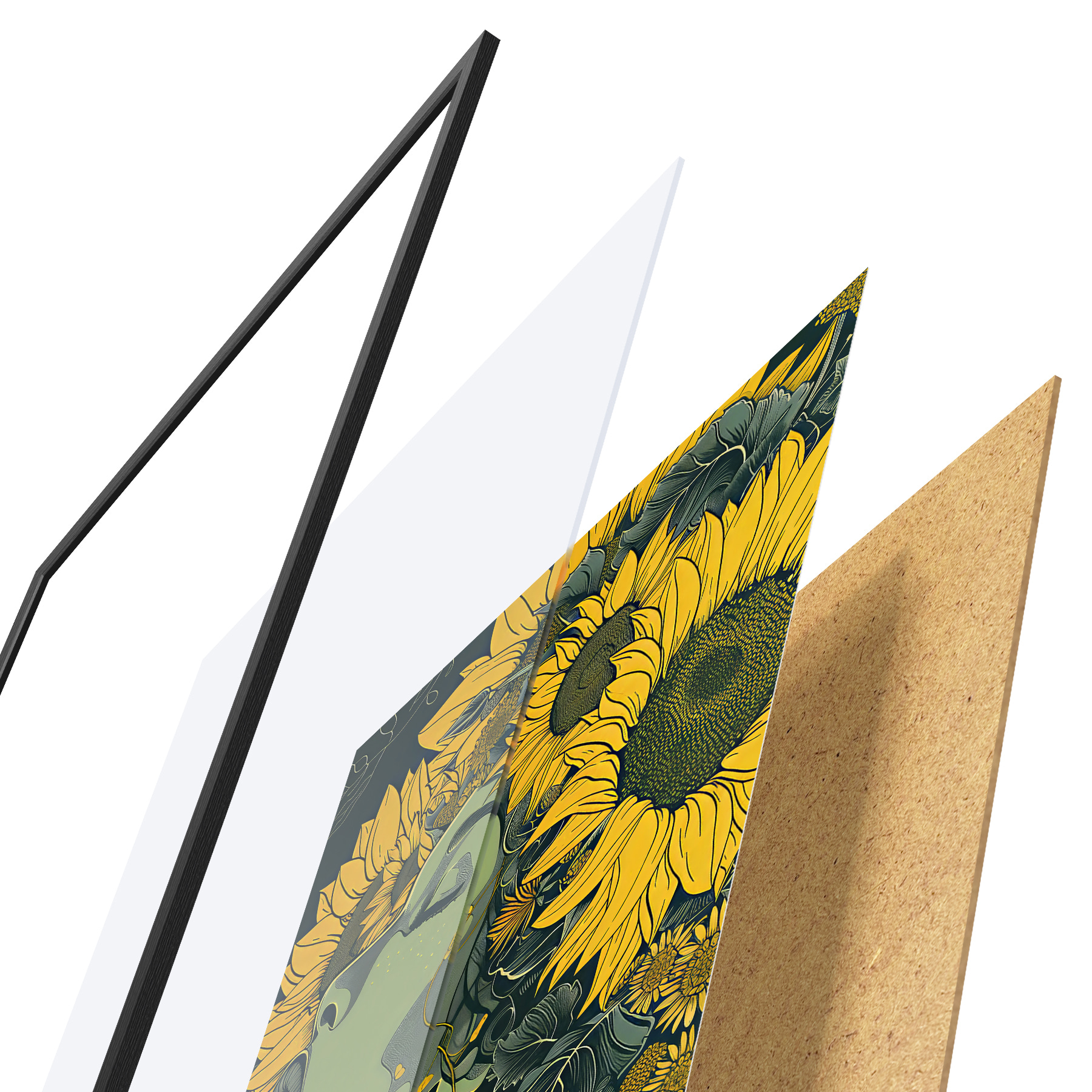 Plakatą sudaro rėmas, pleksiklas, atspausdintas vaizdas ir medžio drožlių plokštės pagrindas. Plakatą galima iš karto pakabinti ant sienos dėl kitoje pusėje esančių laikiklių.