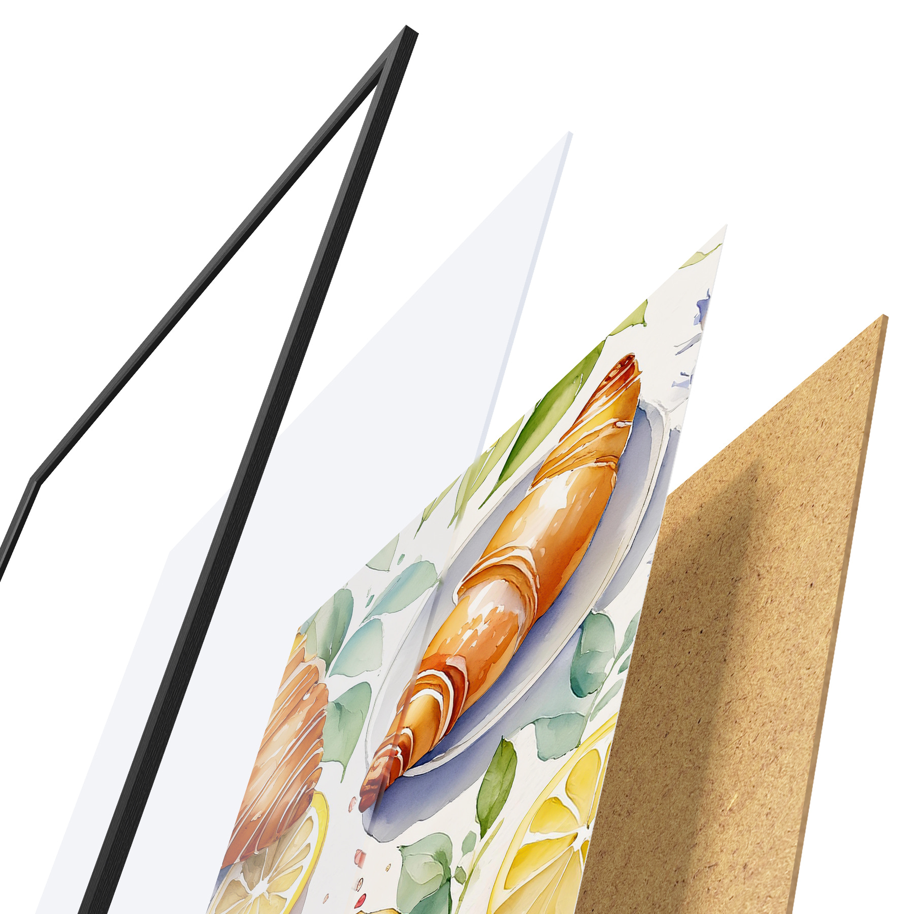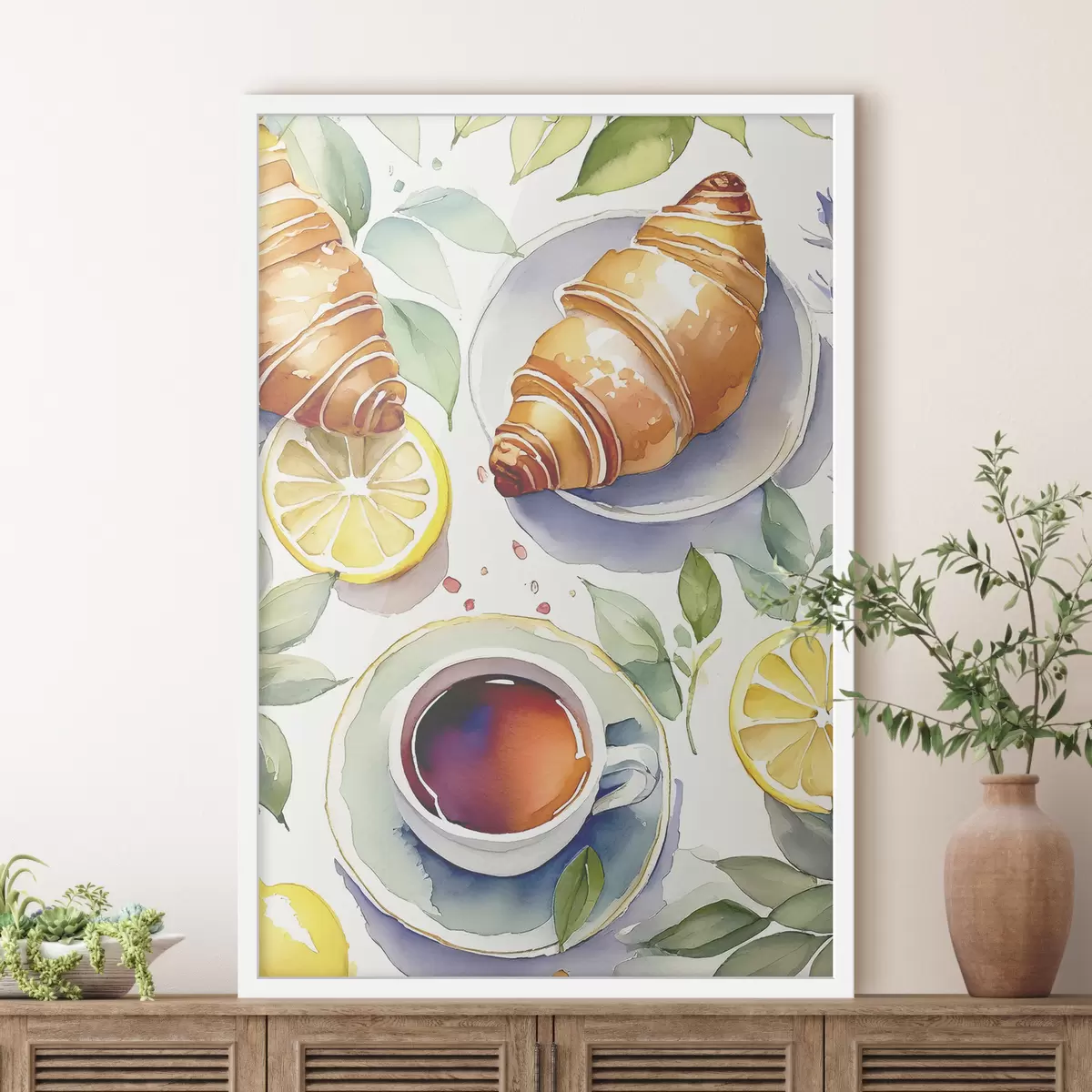 Plakatas Kruasano akvarelė, arbatos puodelis, pusryčiai, citrinos, kaimiškas stilius f38389