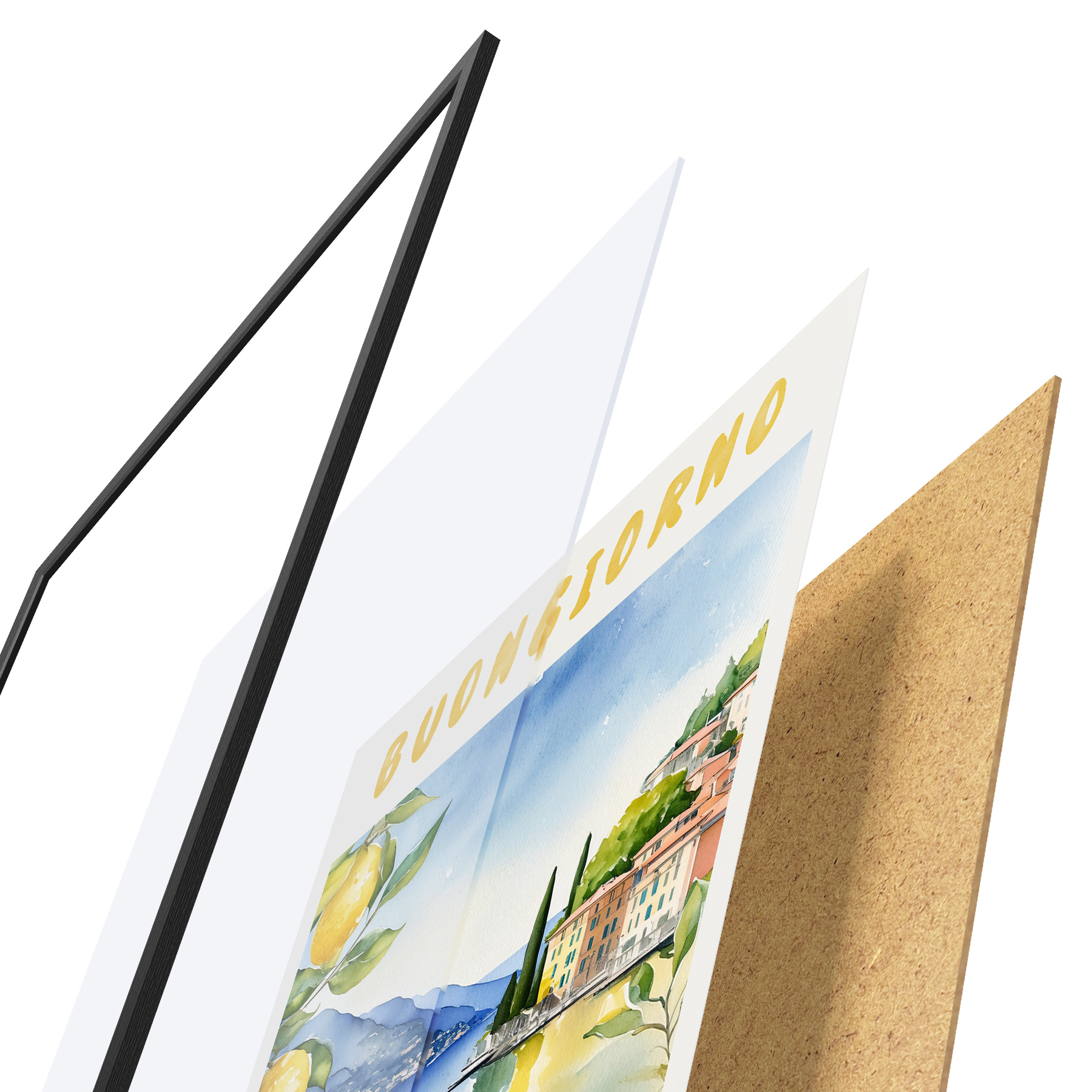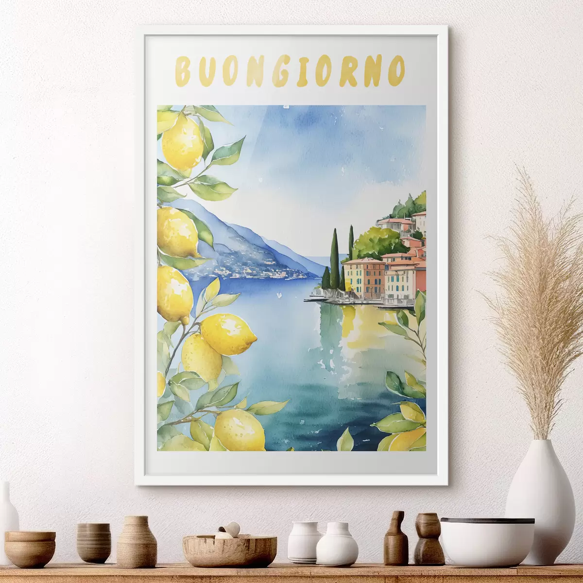 Plakatas Italijos ežeras, vasara, akvarelė, gamtos peizažas, citrinos, miesto architektūra Ne f38394