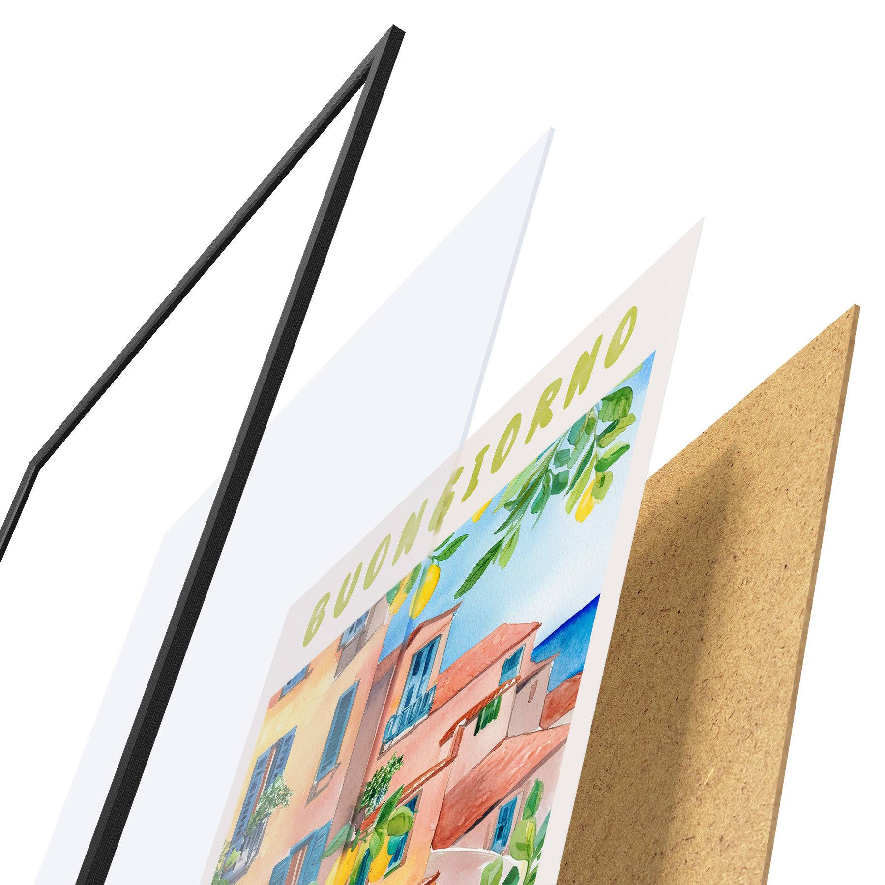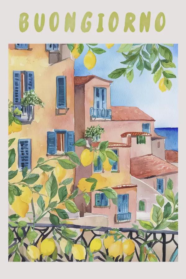 Plakatas Italijos miesto architektūra, jūros pakrantė, vasara, akvarelė, citrinmedis Ne f38395