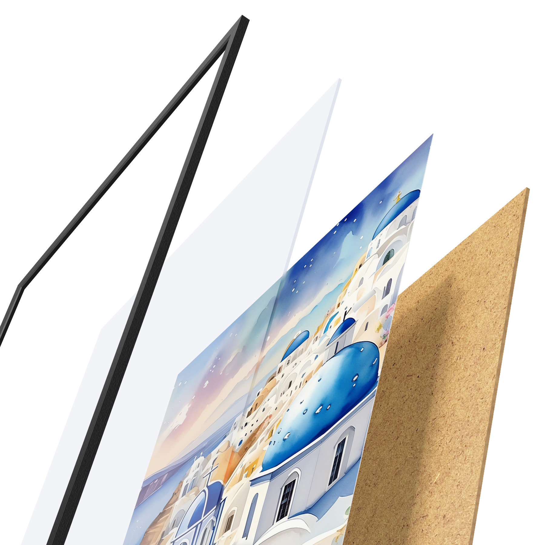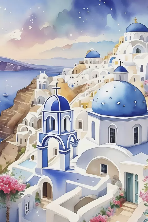 Plakatas Santorini, Graikija architektūra, akvarelė, gėlės, Viduržemio jūros pakrantė f38401