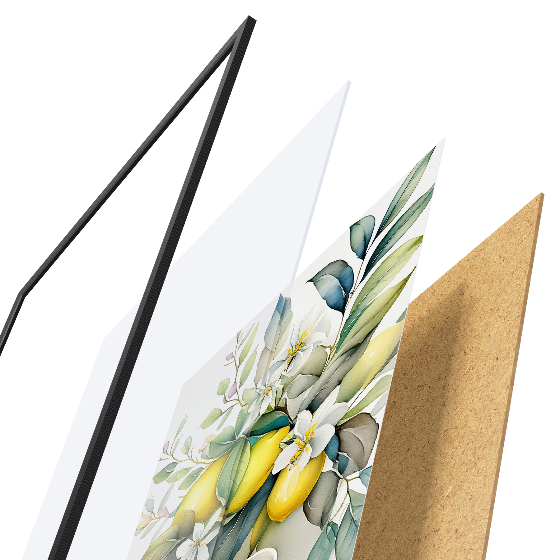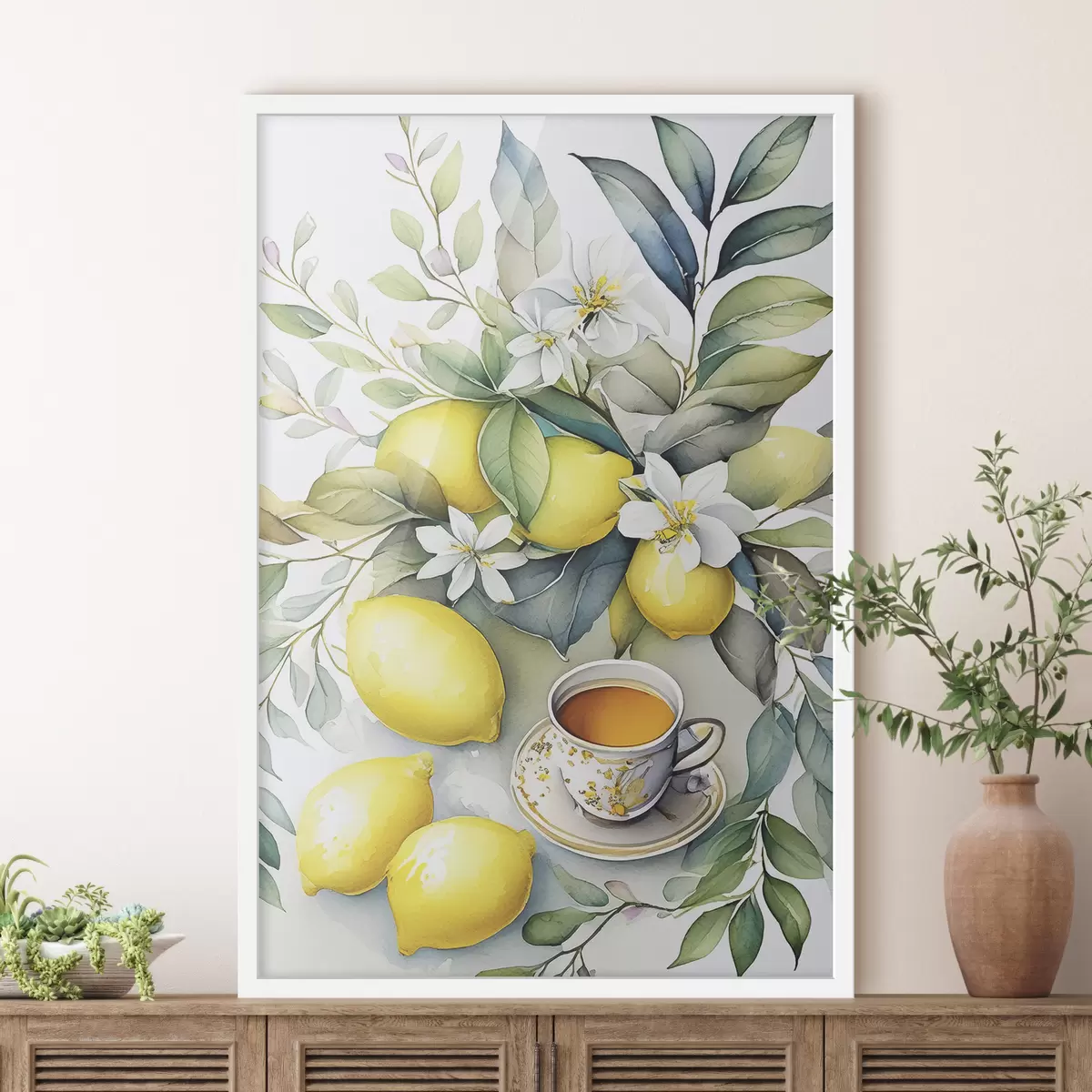 Plakatas Citrinos ir gėlės, akvarelė, pusryčiai, arbatos puodelis, bohemiškas stilius Ne f38403