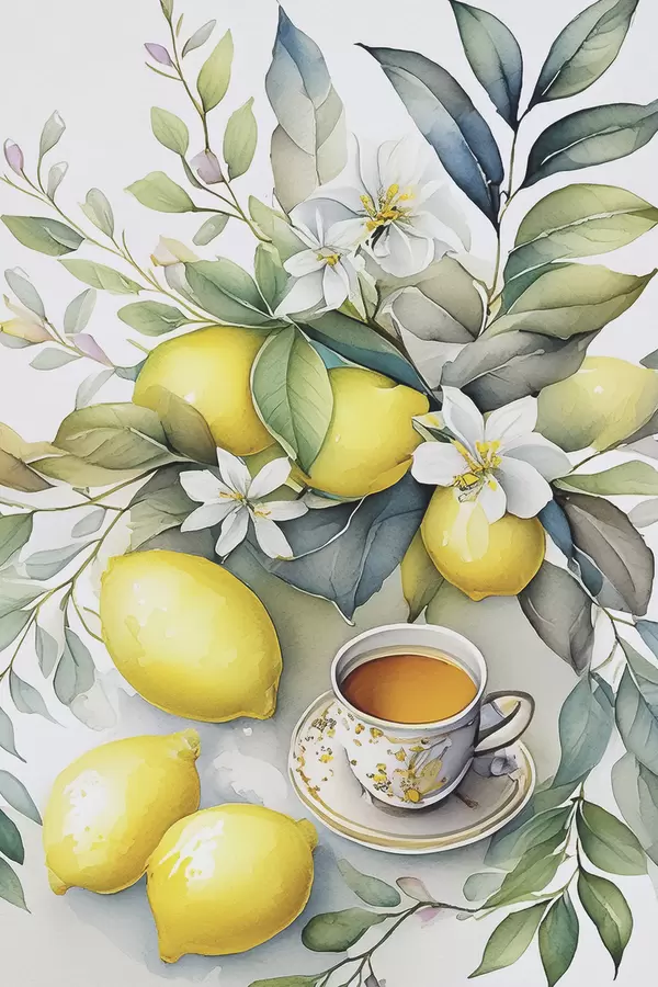 Plakatas Citrinos ir gėlės, akvarelė, pusryčiai, arbatos puodelis, bohemiškas stilius Ne f38403