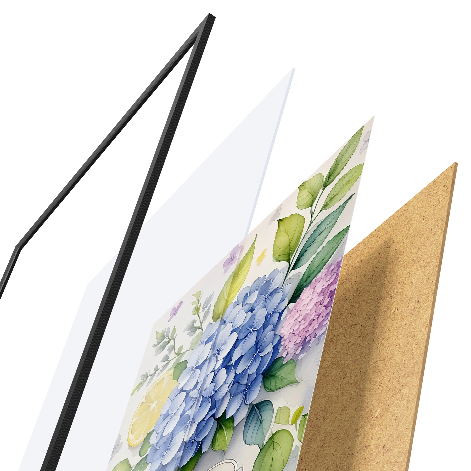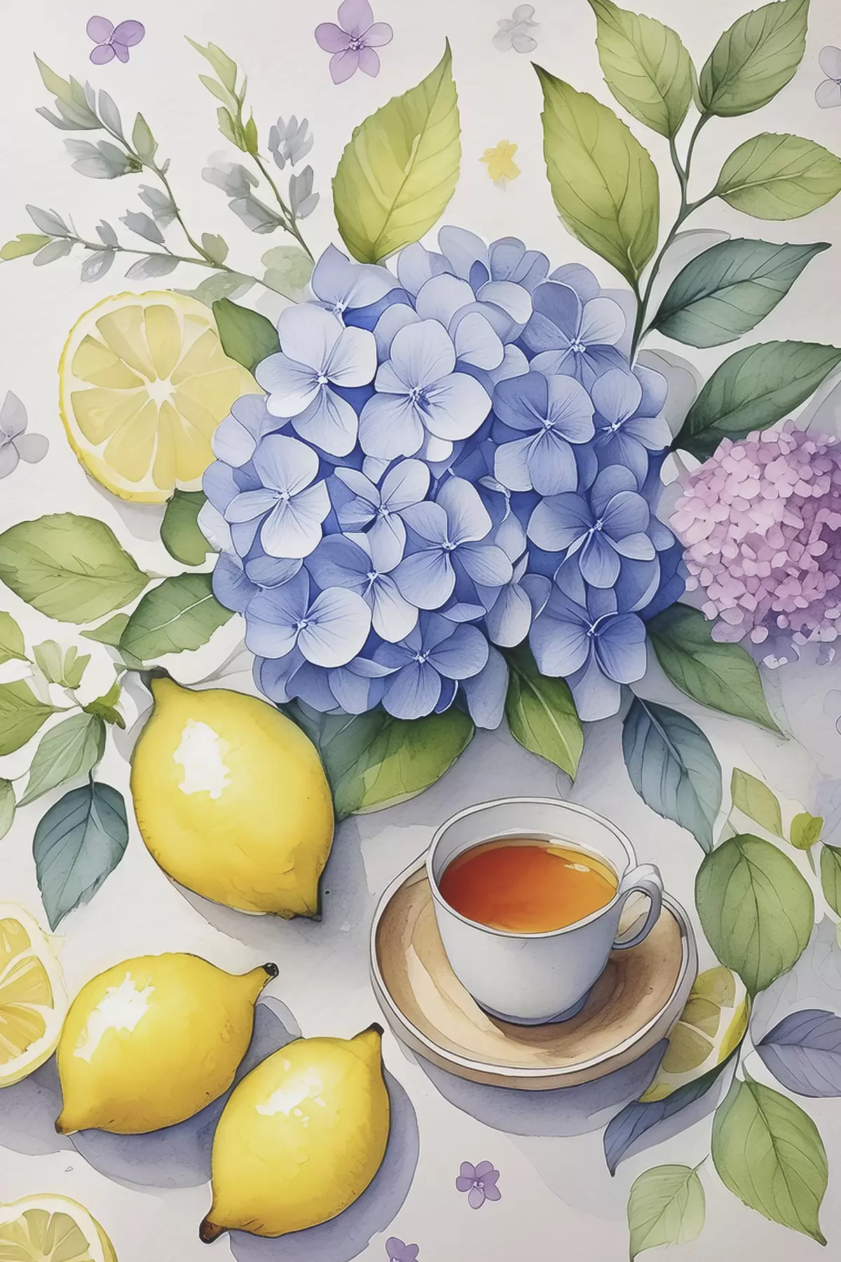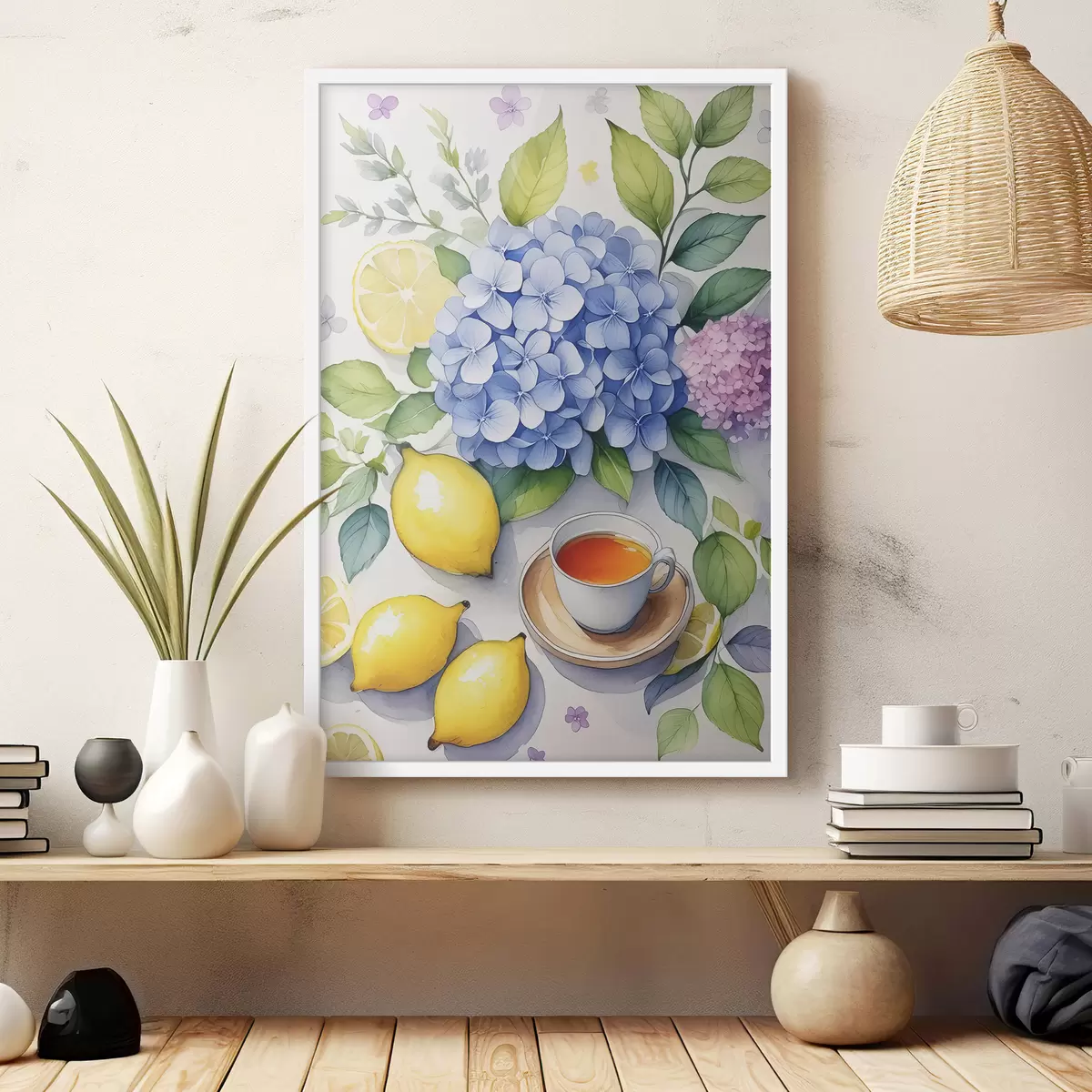 Plakatas Citrinos ir hortenzijos žiedai, akvarelė, pusryčiai, arbatos puodelis, bohemiškas stilius Ne f38404