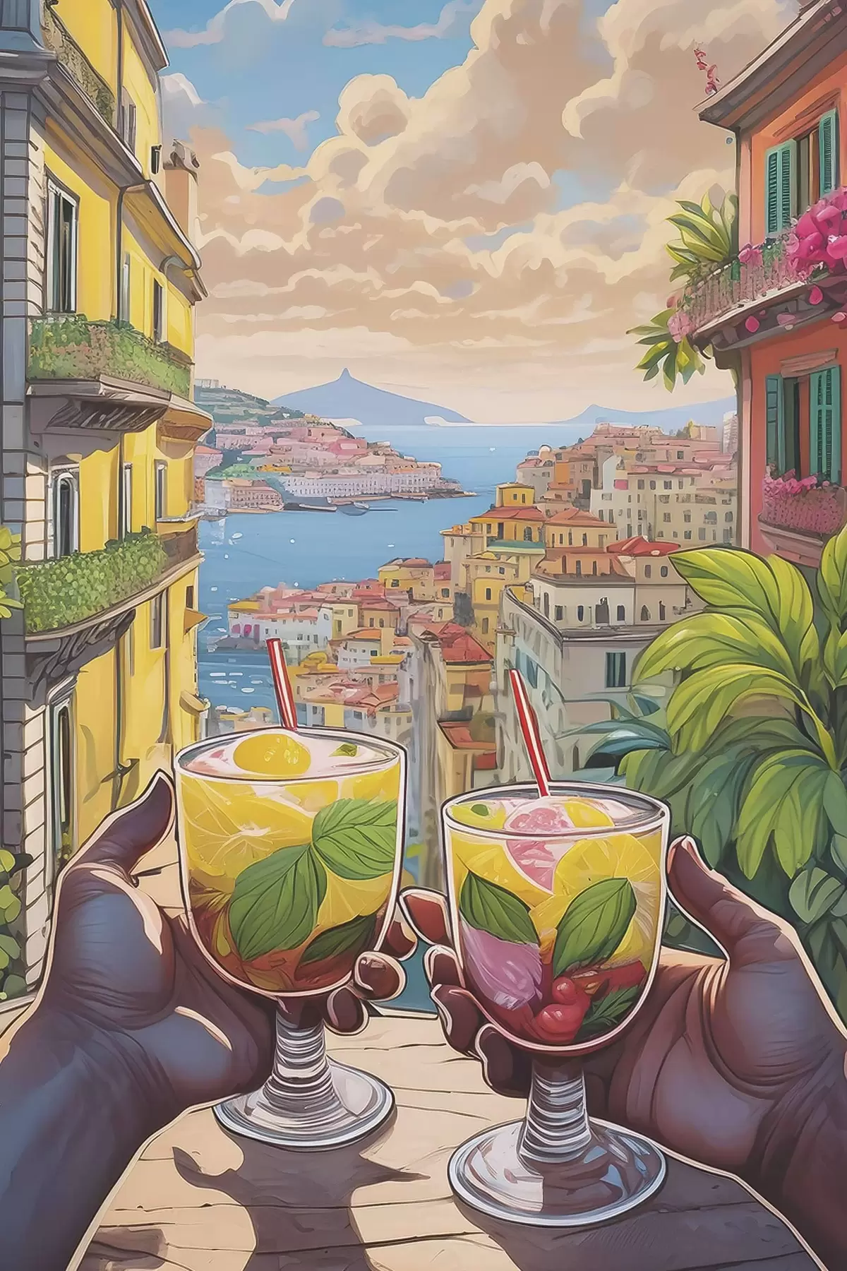 Plakatas Pora rankų, laikančių stiklines su vaisiais ir lapais. Ne f38405