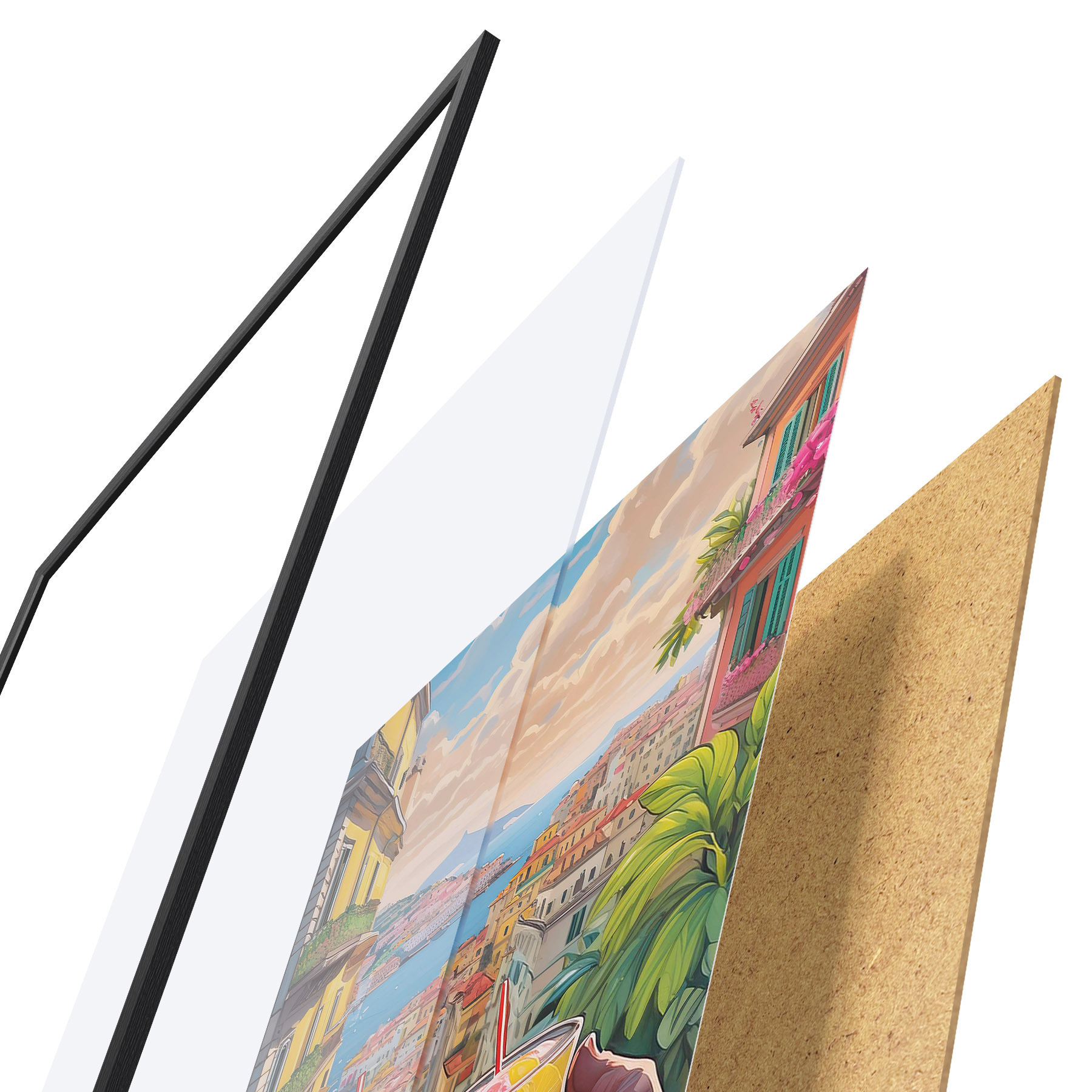Plakatą sudaro rėmas, pleksiklas, atspausdintas vaizdas ir medžio drožlių plokštės pagrindas. Plakatą galima iš karto pakabinti ant sienos dėl kitoje pusėje esančių laikiklių.