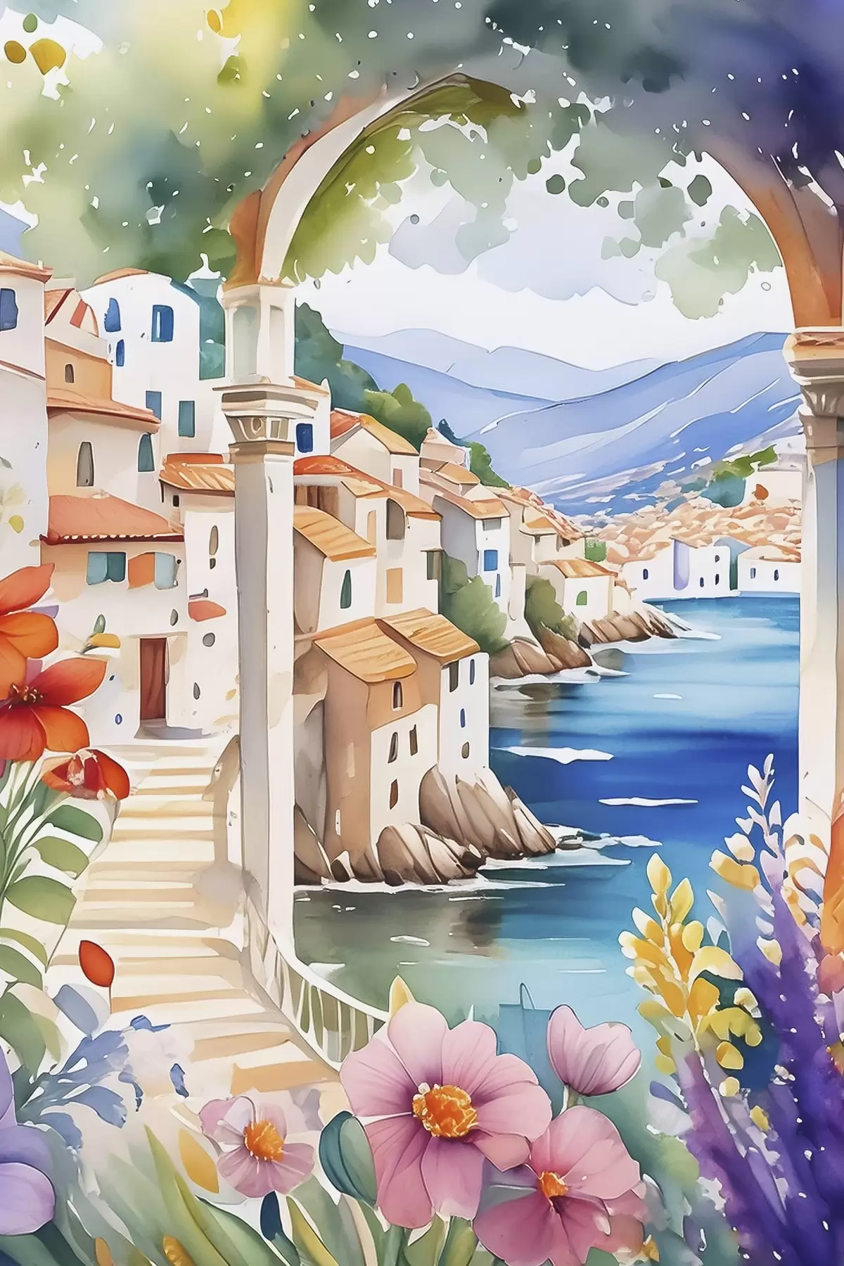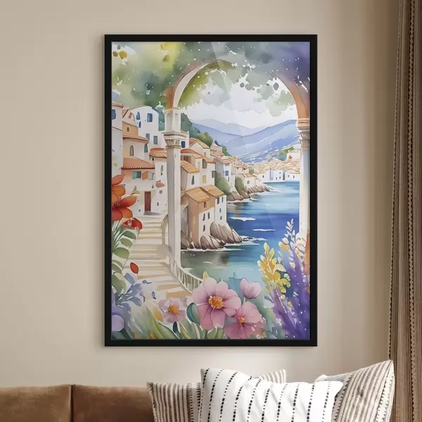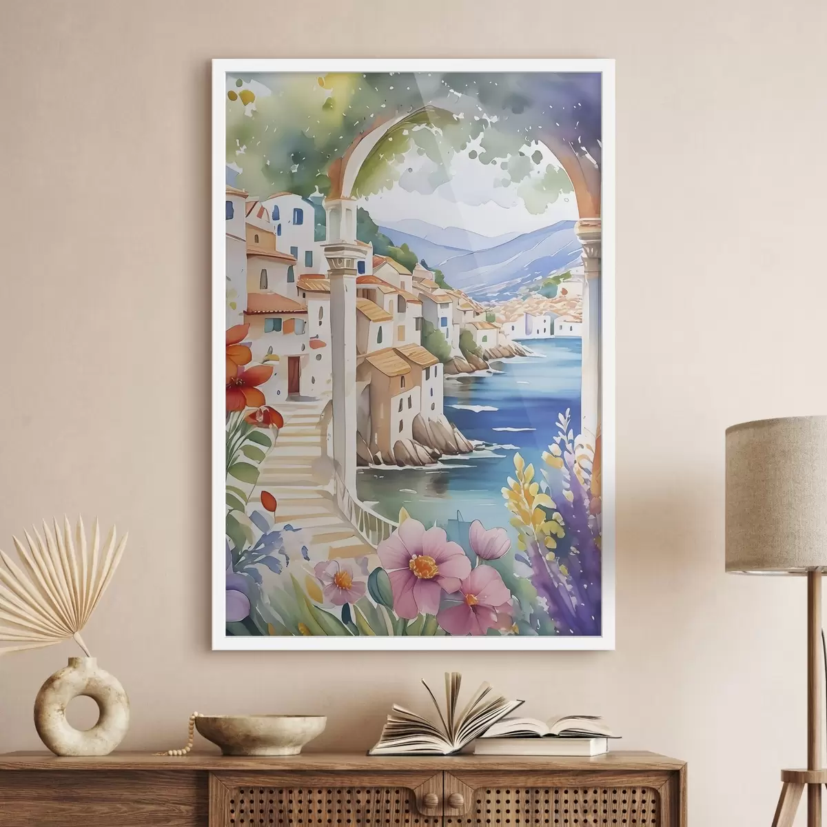 Plakatas Miesto vaizdas su upe ir gėlėmis f38406