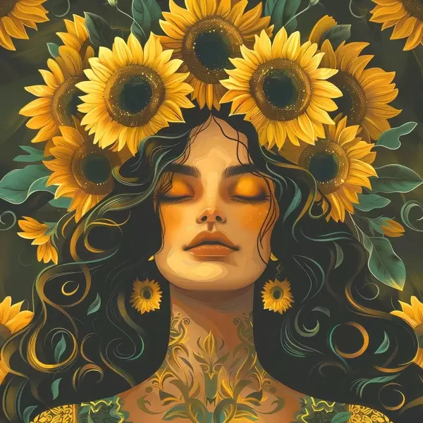 Plakatas Moteris su saulėgrąžomis plaukuose f38412