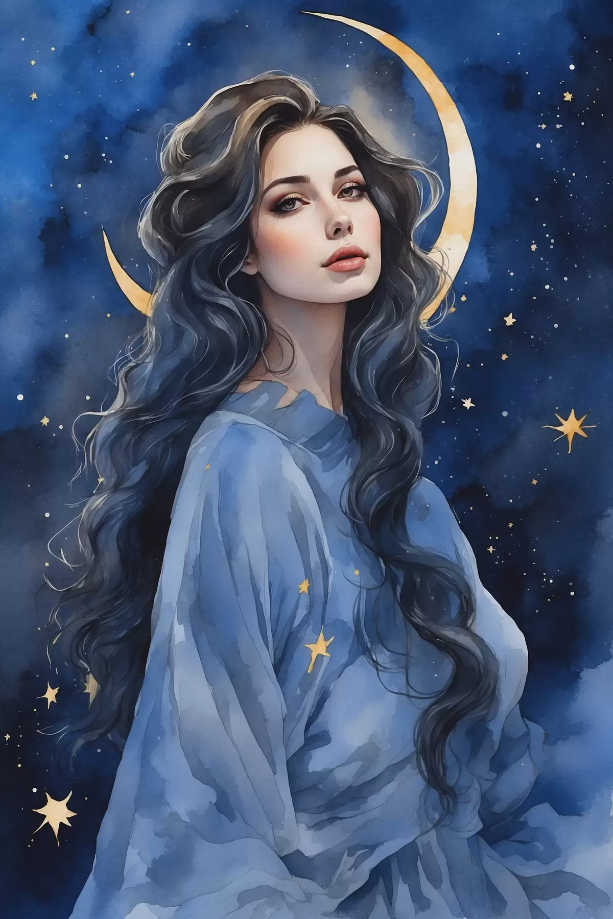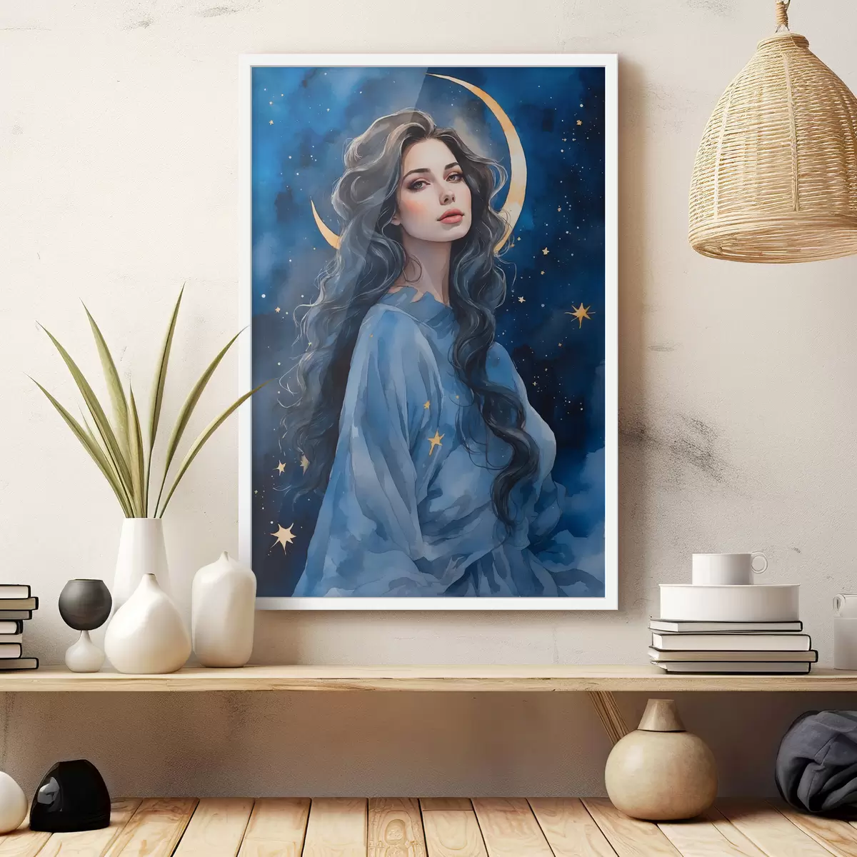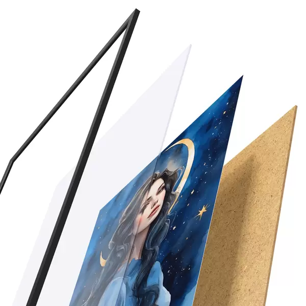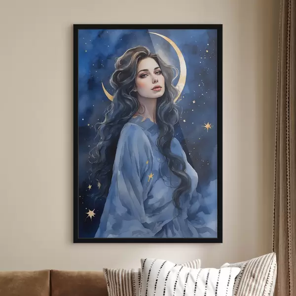 Plakatas Mergina mėlyna suknele mėnulio ir žvaigždžių fone f38427