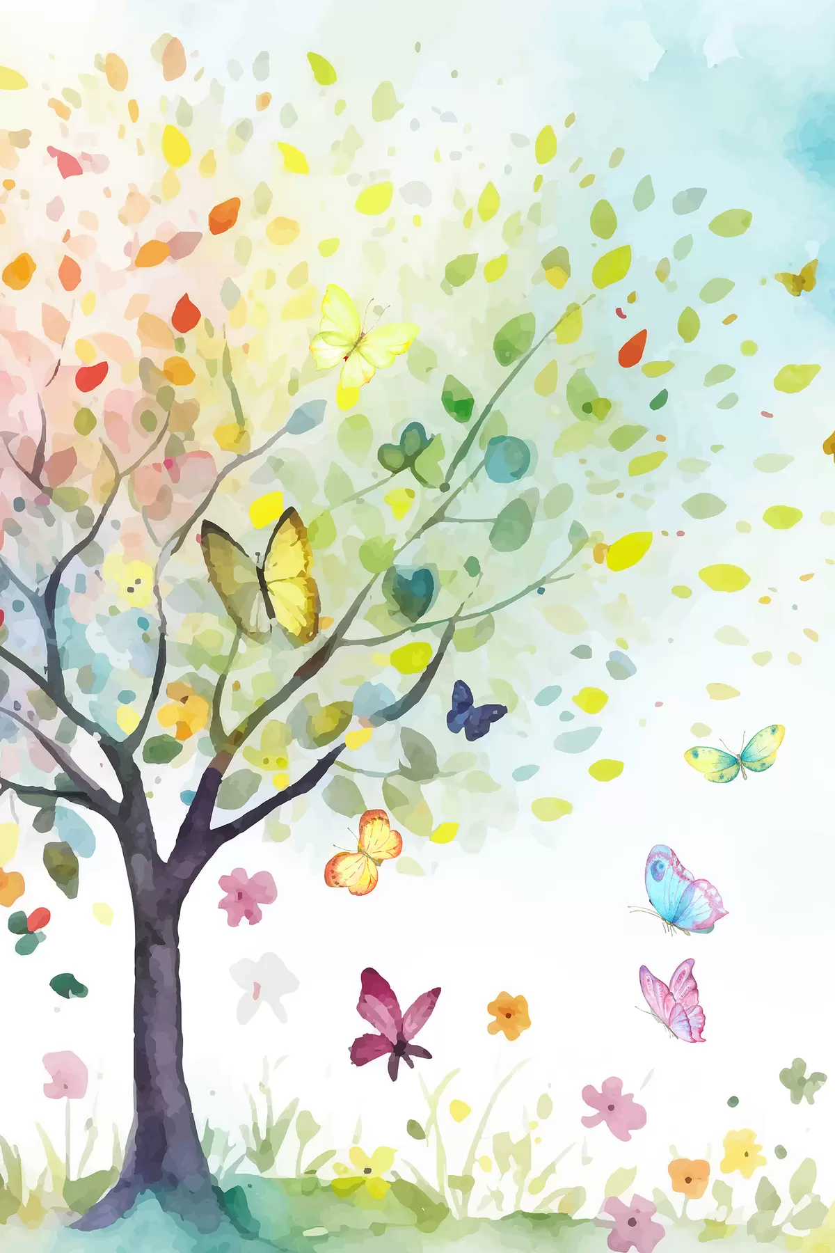 Plakatas medis su ryškiais lapais, akvareliniais dažais, drugeliais f38444