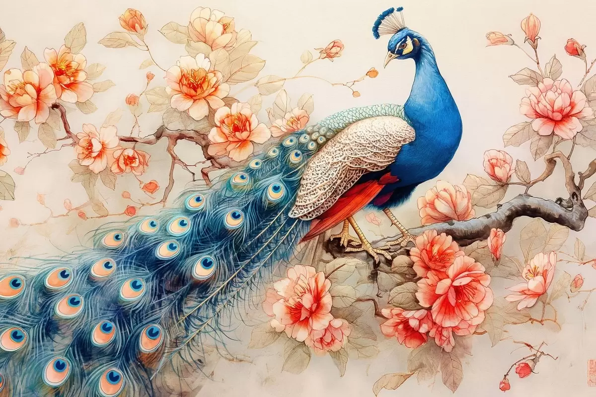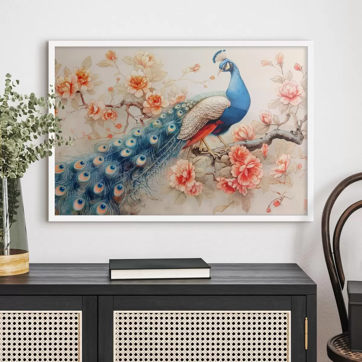 Plakatas Vaizdas, rodantis povas ant šakos su gėlėmis f38451