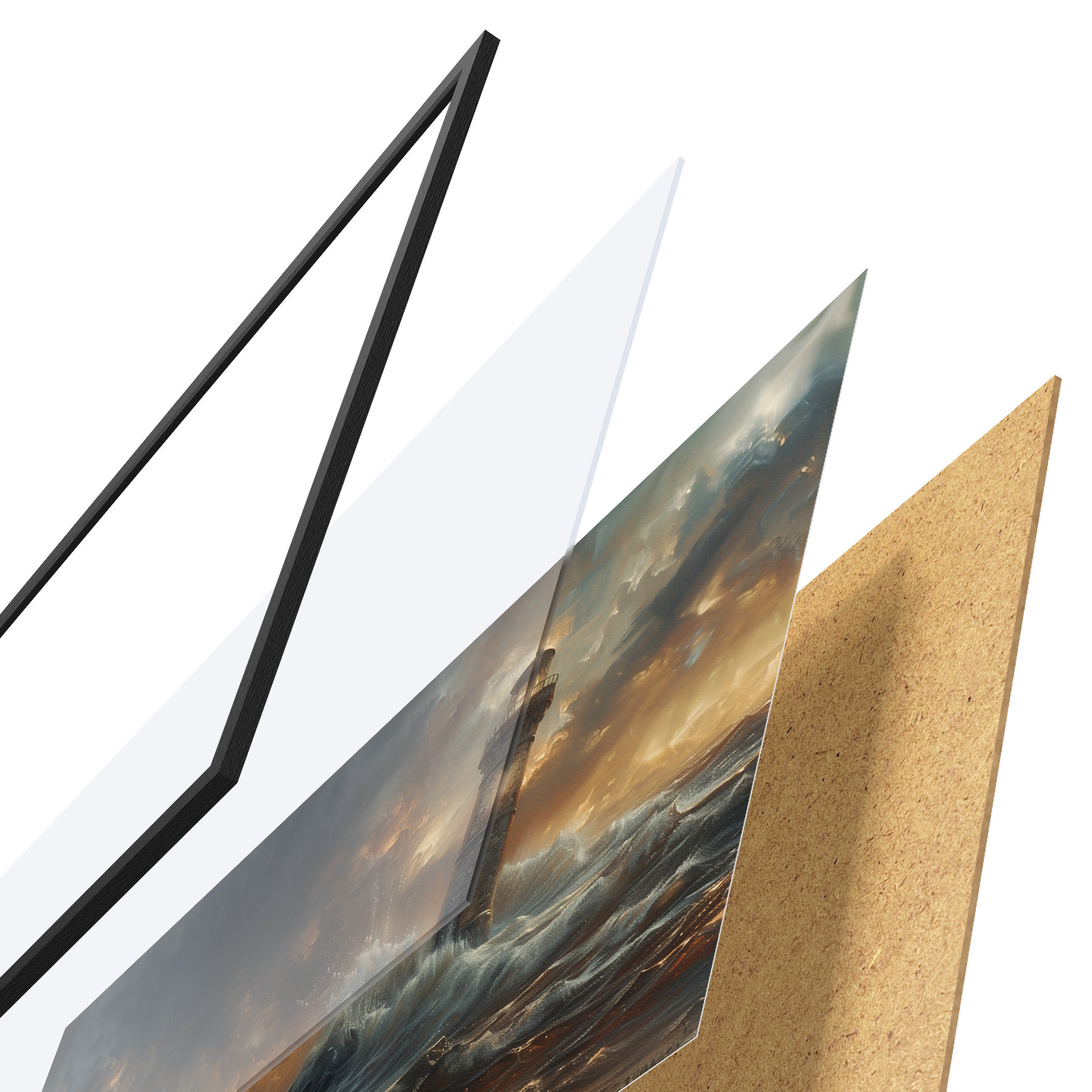 Plakatą sudaro rėmas, pleksiklas, atspausdintas vaizdas ir medžio drožlių plokštės pagrindas. Plakatą galima iš karto pakabinti ant sienos dėl kitoje pusėje esančių laikiklių.