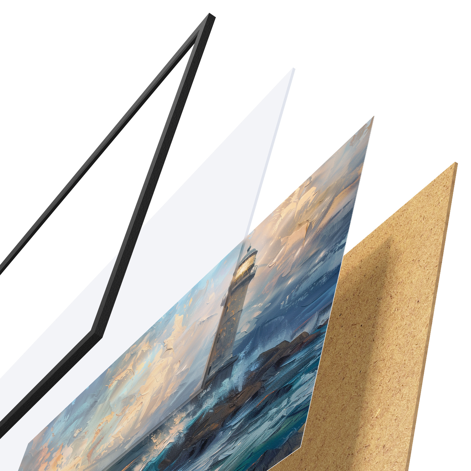 Plakatą sudaro rėmas, pleksiklas, atspausdintas vaizdas ir medžio drožlių plokštės pagrindas. Plakatą galima iš karto pakabinti ant sienos dėl kitoje pusėje esančių laikiklių.