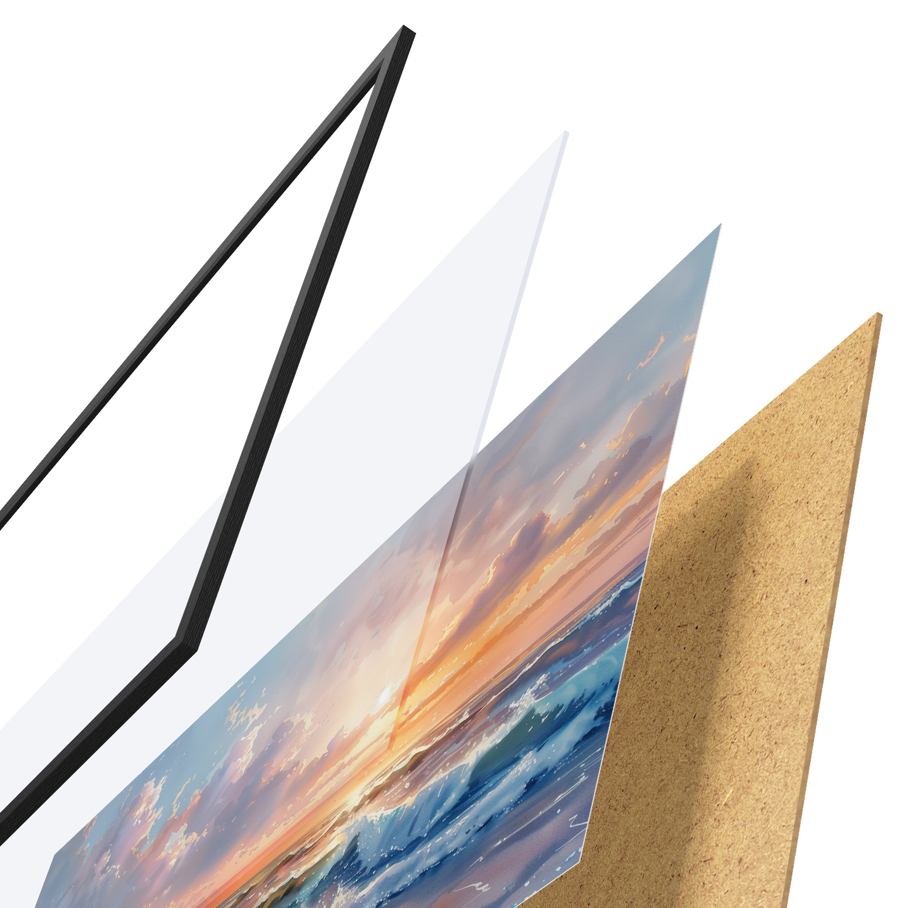 Plakatą sudaro rėmas, pleksiklas, atspausdintas vaizdas ir medžio drožlių plokštės pagrindas. Plakatą galima iš karto pakabinti ant sienos dėl kitoje pusėje esančių laikiklių.