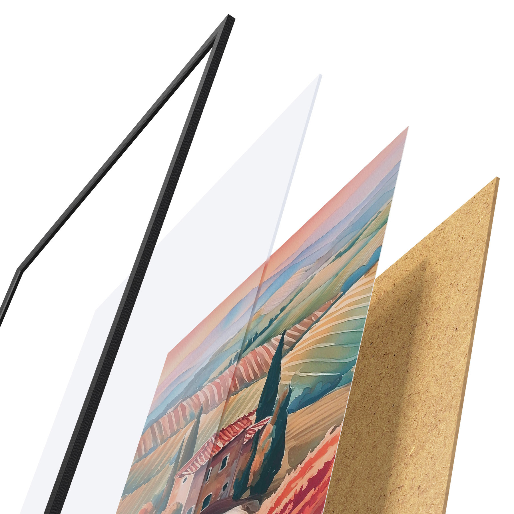 Plakatą sudaro rėmas, pleksiklas, atspausdintas vaizdas ir medžio drožlių plokštės pagrindas. Plakatą galima iš karto pakabinti ant sienos dėl kitoje pusėje esančių laikiklių.