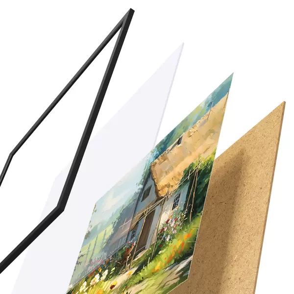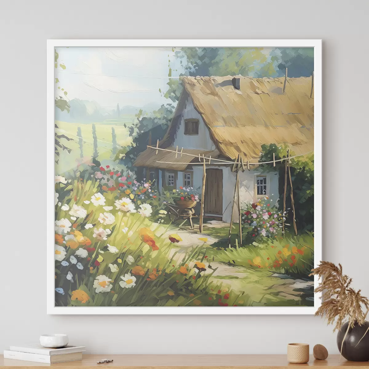 Plakatas Kaimo namas su sodu, vasaros gėlėmis, alyviniais dažais, teptuko potėpiais, laukas, kaimiškas stilius f38491