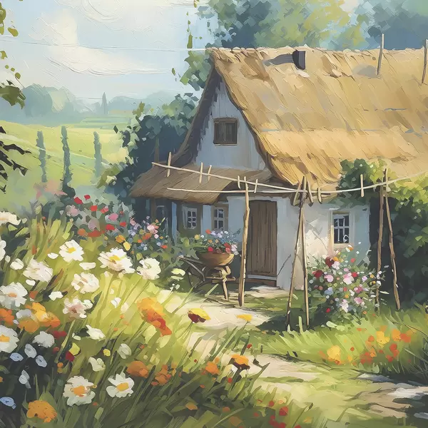 Plakatas Kaimo namas su sodu, vasaros gėlėmis, alyviniais dažais, teptuko potėpiais, laukas, kaimiškas stilius f38491