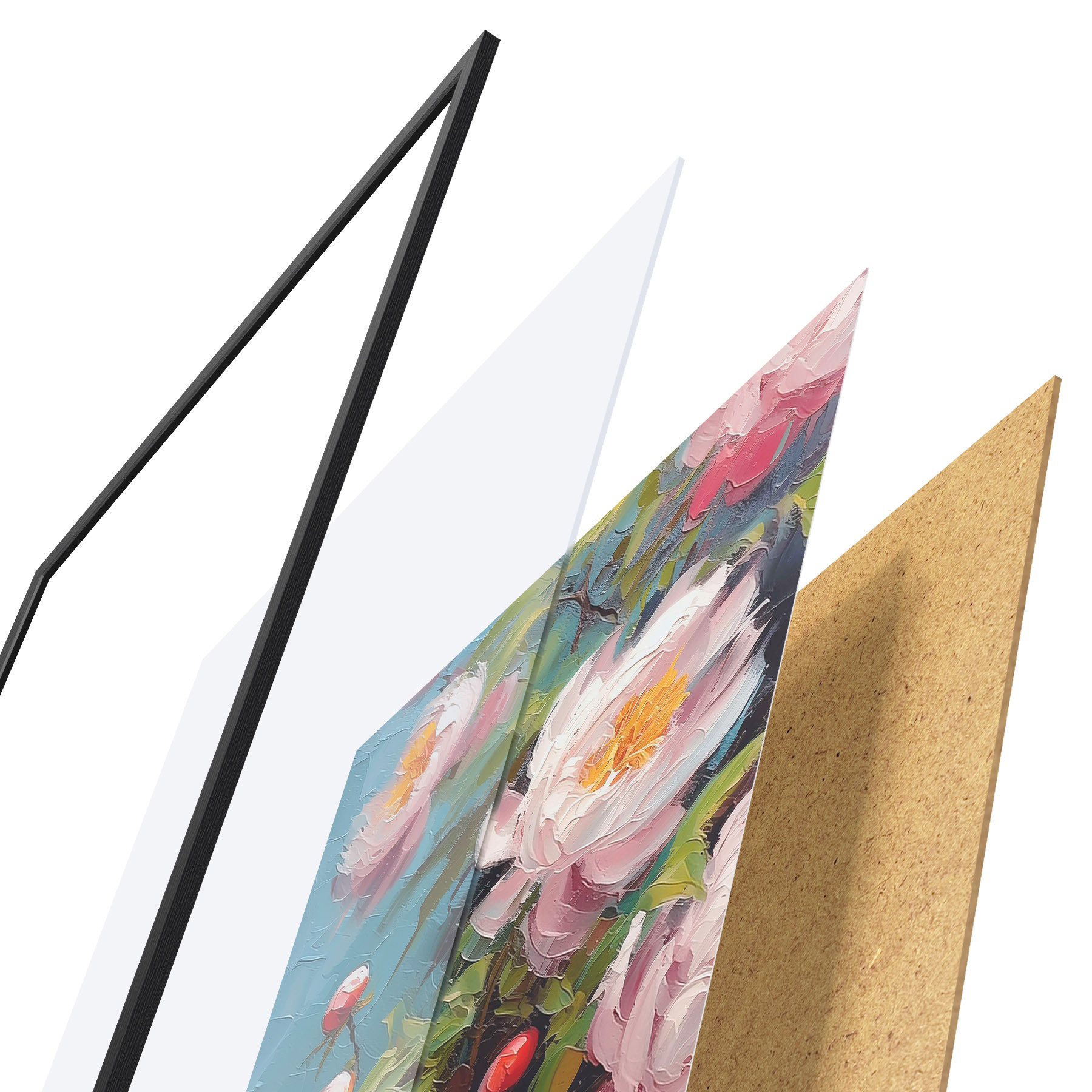 Plakatą sudaro rėmas, pleksiklas, atspausdintas vaizdas ir medžio drožlių plokštės pagrindas. Plakatą galima iš karto pakabinti ant sienos dėl kitoje pusėje esančių laikiklių.