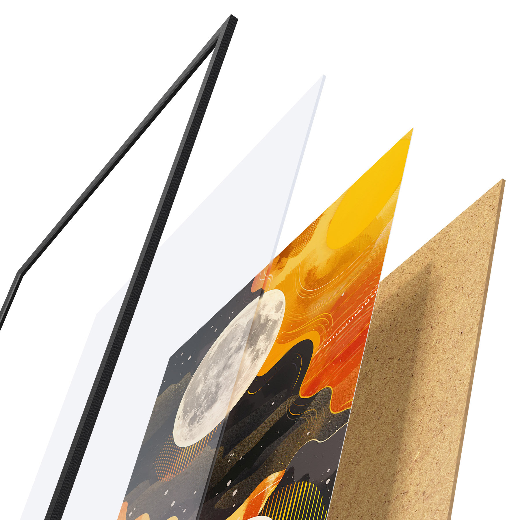 Plakatą sudaro rėmas, pleksiklas, atspausdintas vaizdas ir medžio drožlių plokštės pagrindas. Plakatą galima iš karto pakabinti ant sienos dėl kitoje pusėje esančių laikiklių.