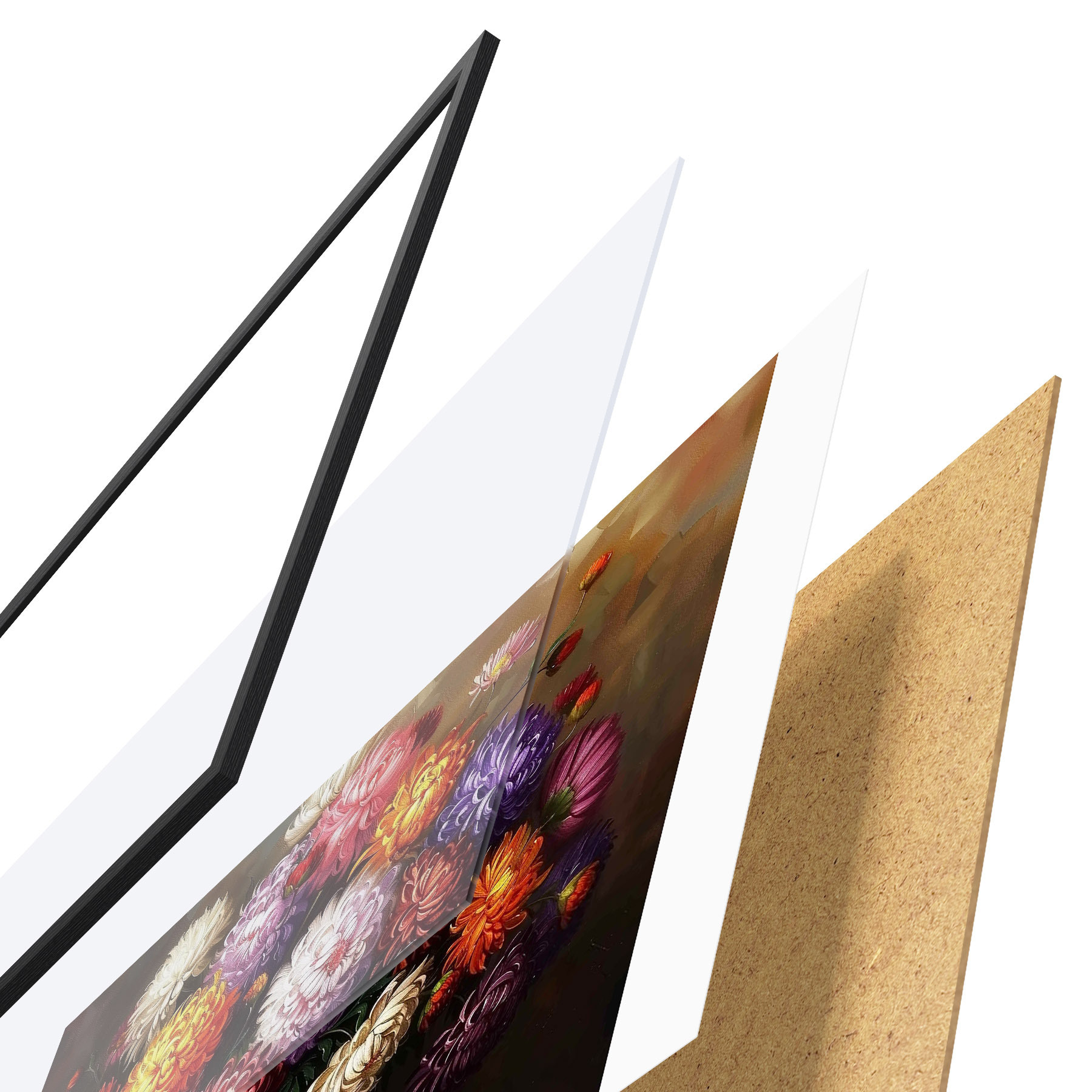 Plakatą sudaro rėmas, pleksiklas, atspausdintas vaizdas ir medžio drožlių plokštės pagrindas. Plakatą galima iš karto pakabinti ant sienos dėl kitoje pusėje esančių laikiklių.