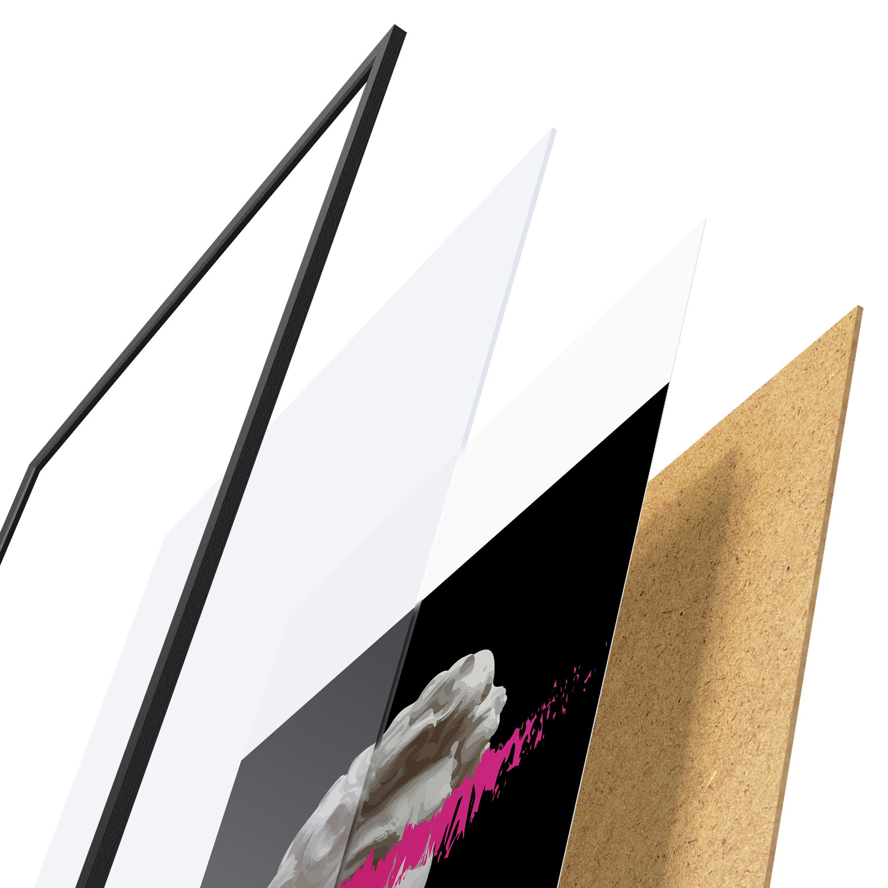 Plakatą sudaro rėmas, pleksiklas, atspausdintas vaizdas ir medžio drožlių plokštės pagrindas. Plakatą galima iš karto pakabinti ant sienos dėl kitoje pusėje esančių laikiklių.