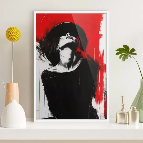 Plakatas Moteris su juoda skrybėle raudoname fone f38561